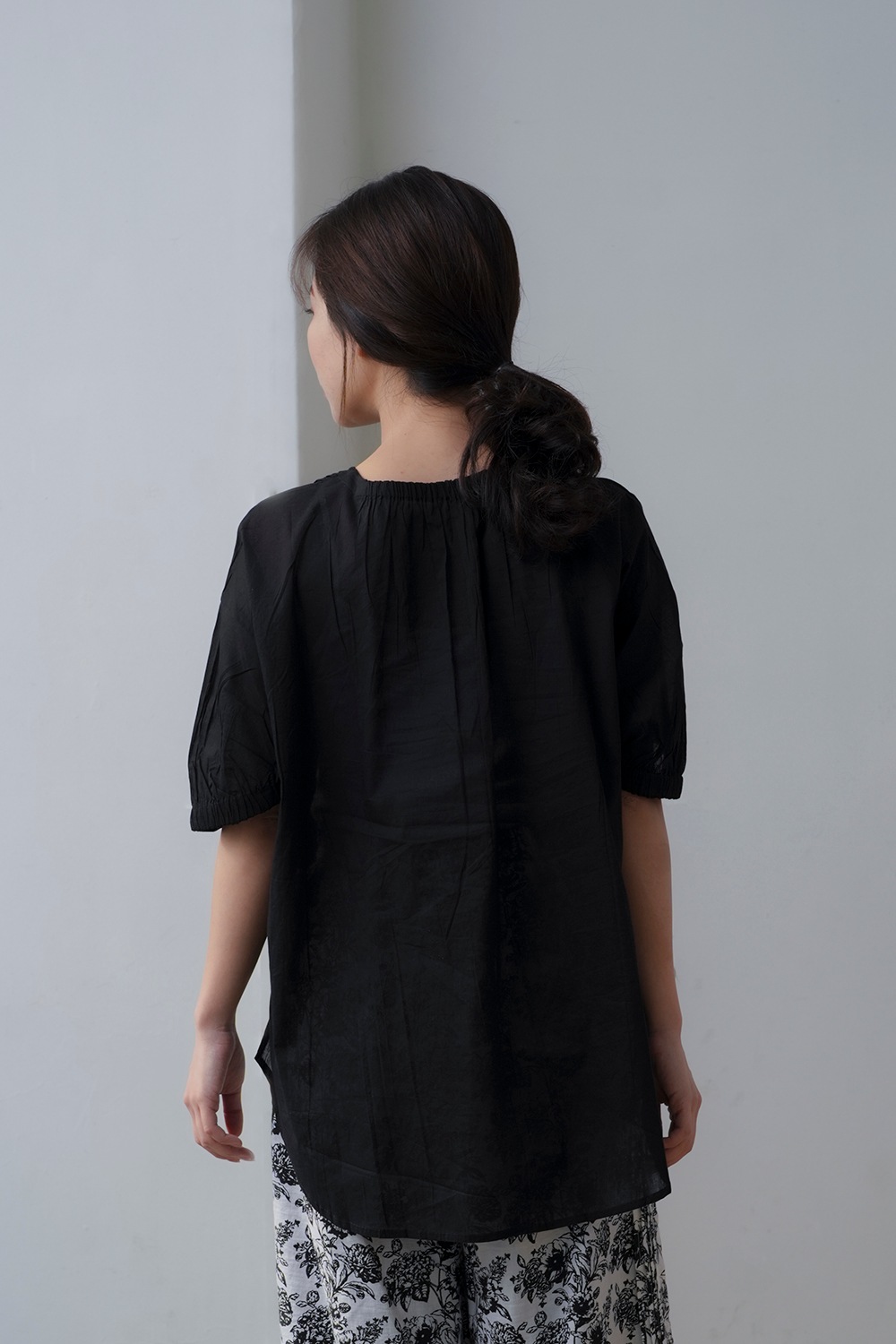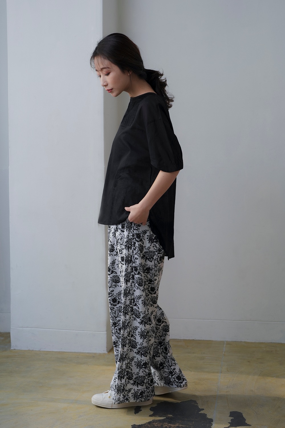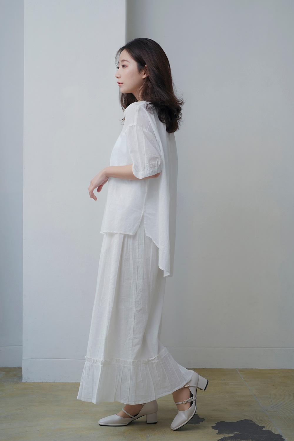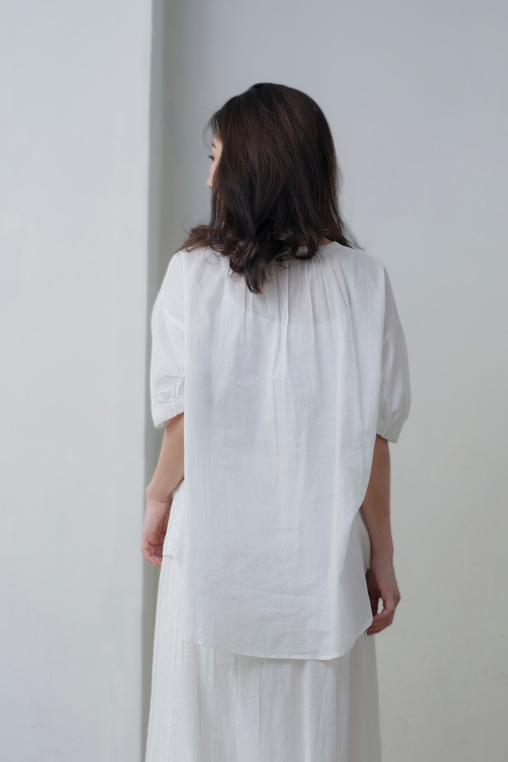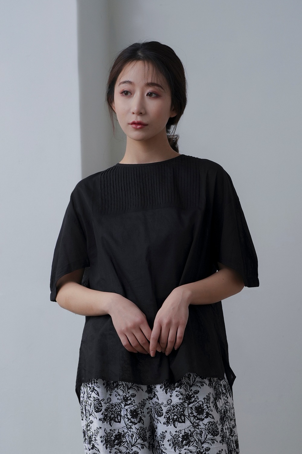 胸元に施された細やかなピンタックが特徴的な、シンプルながらも拘りのつまった一枚。 シルエットは前後差のあるデザインで自然なドレープ感を作り出し、動くたびに優雅な雰囲気を演出します。 さらりとした風合いのコットン素材を使用し、ふんわりとした軽やかな着心地を実現。 通気性に優れたナチュラルな質感が心地よく、汗ばむ季節でも肌に張り付きにくいため、一日中快適に過ごせます。カラーによって印象が変わるので、色違いを揃えていただくのもおすすめです。
