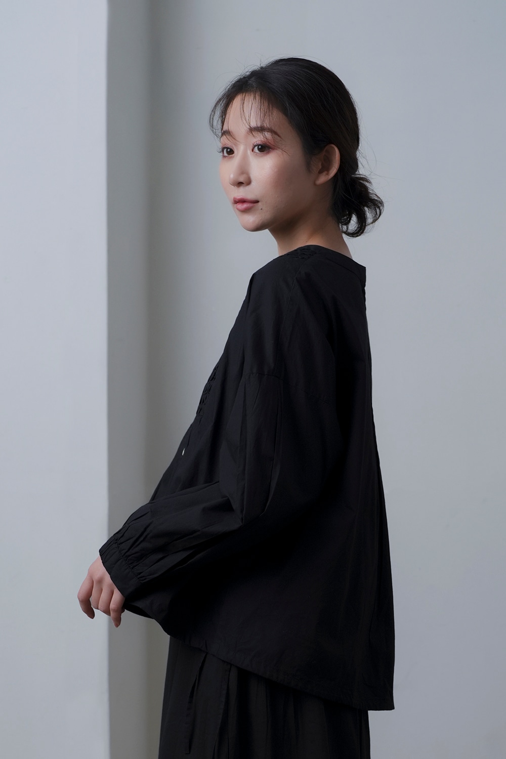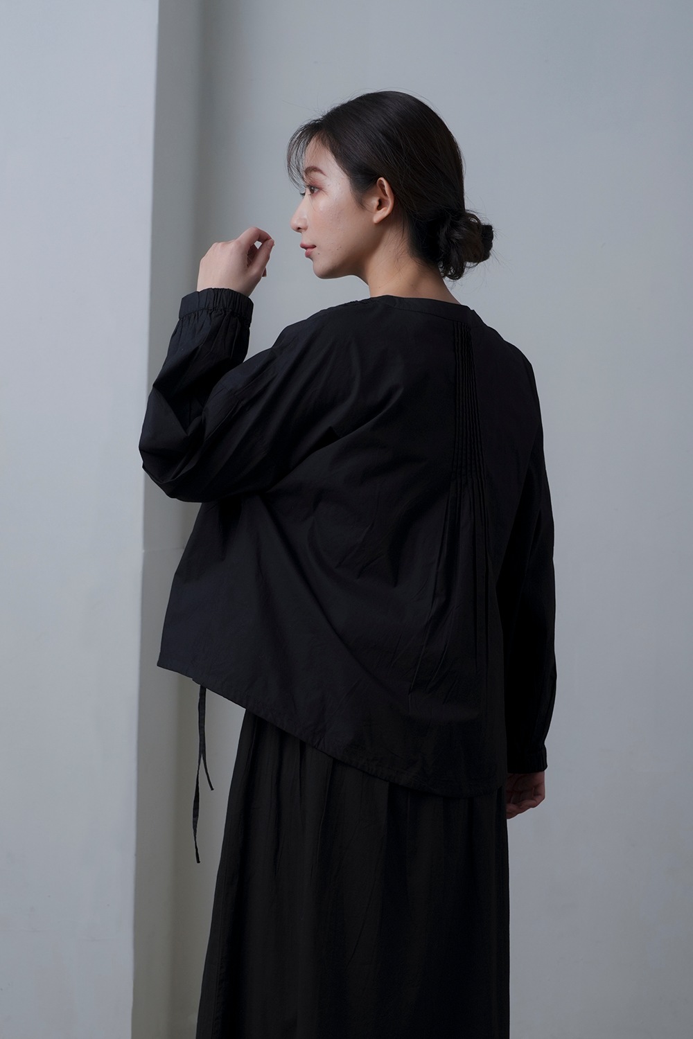 クラシックなシャツデザインにひと味違った個性を加えたブザムシャツブラウス。 胸元の変形ピンタックが特徴的で、規則的なタックではなく、ランダムなつまみタックを施すことで立体感と動きをプラス。 シンプルながらもディテールにこだわったデザインです。 高密度ポプリン素材を採用し、程よいハリ感と上品な光沢が特徴。 肌触りが滑らかでありながら、しっかりとした仕立ての良さを感じさせる生地感が着る人を選びません。 袖口にはギャザーを入れ、ふんわりとしたボリューム感を演出。 袖をまくることでさらにニュアンスのある着こなしが可能に。 存在感のあるデザインはシンプルなアイテムともコーディネートがしやすく飽きのこない一着です。