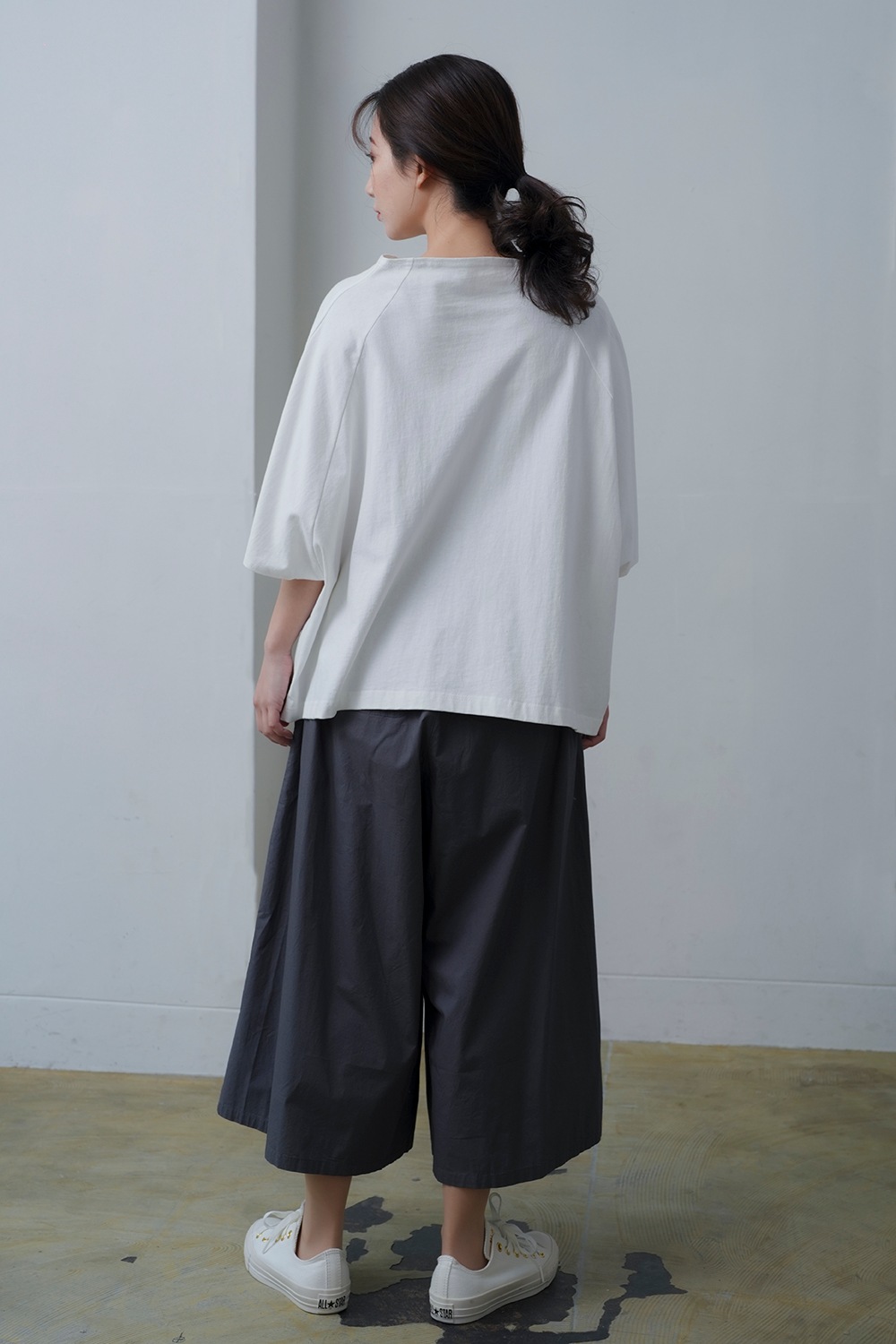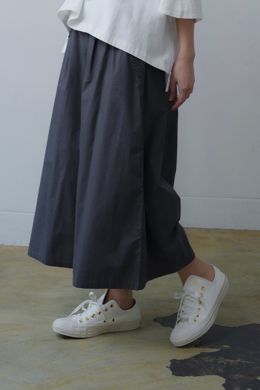 計算されたフレアシルエットが、動きに合わせて美しく広がるパンツ。 裾に向かって広がるラインが、すっきりとした印象を保ちつつ、品のあるボリューム感を演出します。 軽やかながらも適度なハリを持つ高密度ポプリン素材を使用し、さらりと快適な着心地です。 ナチュラルな光沢感があり、シンプルながらも上質な雰囲気を醸し出します。 ウエストはゴム仕様でストレスフリーな履き心地を実現。 サイドにはピンタックを施し、控えめながらも立体感のあるデザインが、シンプルなコーディネートに奥行きをプラスします。 スニーカーと合わせてカジュアルに、ヒールでドレッシーにと幅広い着こなしが可能。 シーズンレスで活躍する、ワードローブに加えて頂きたい一本です。