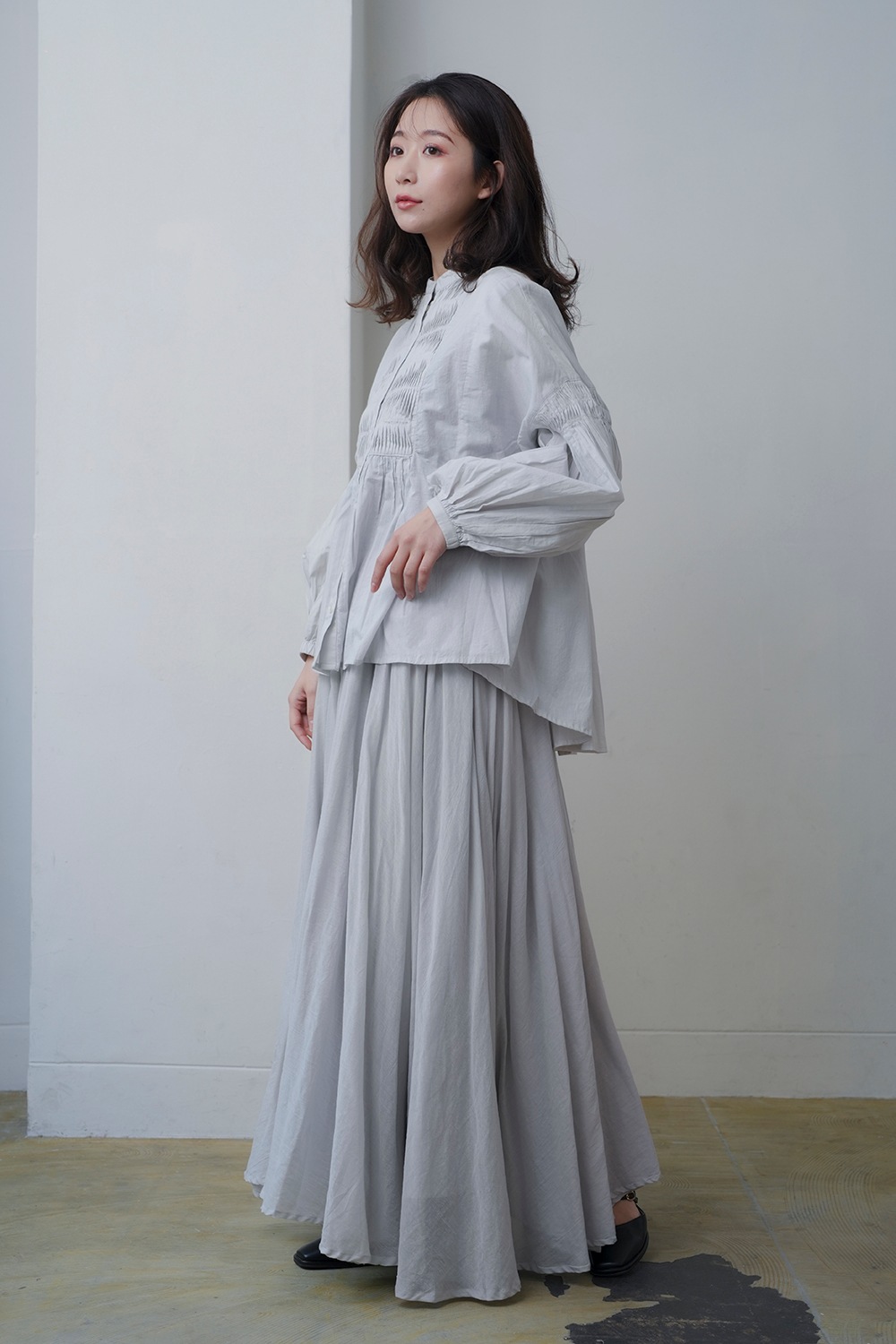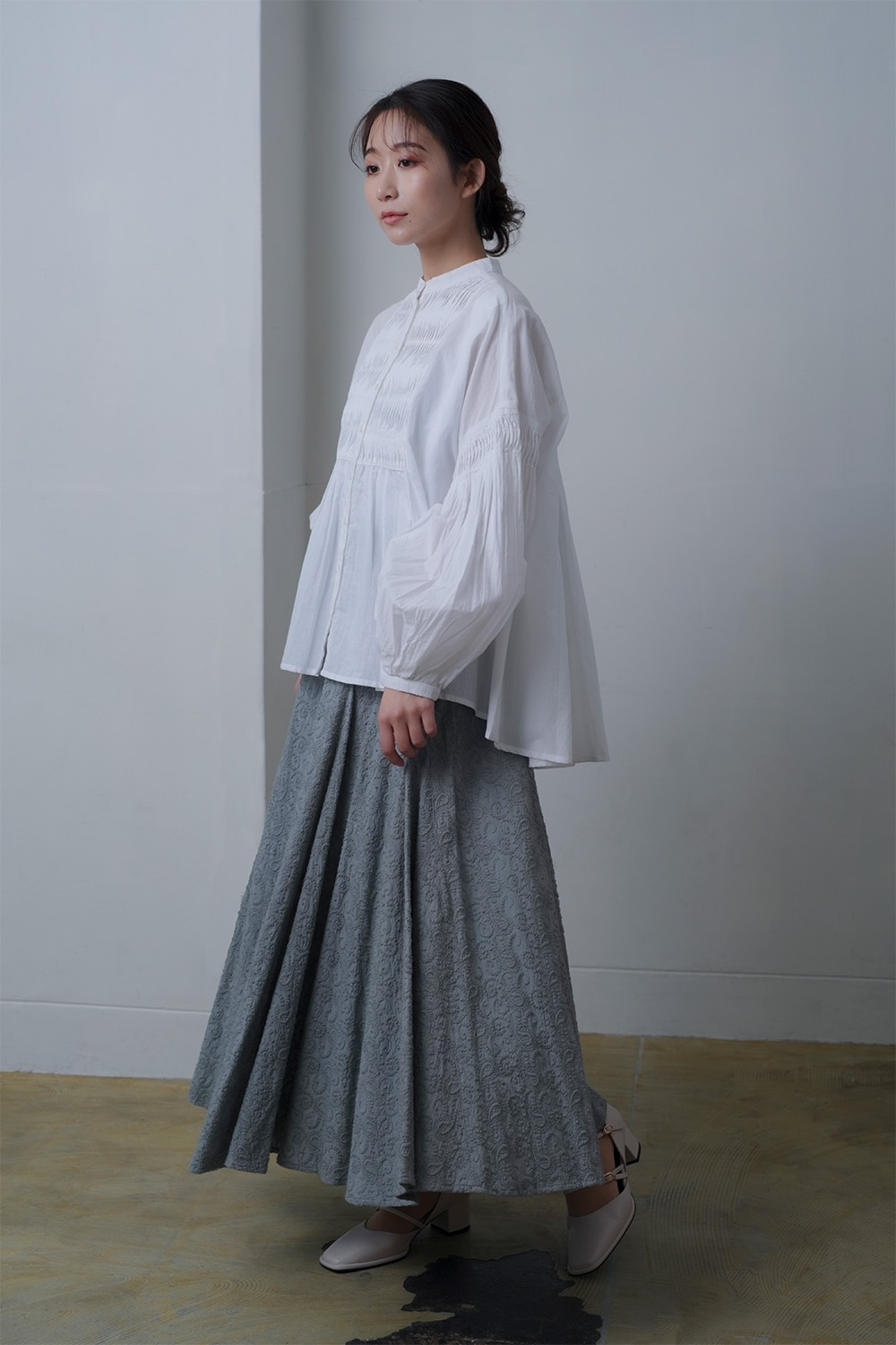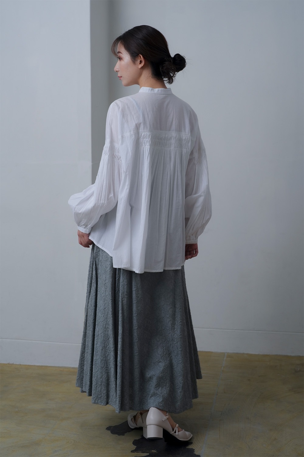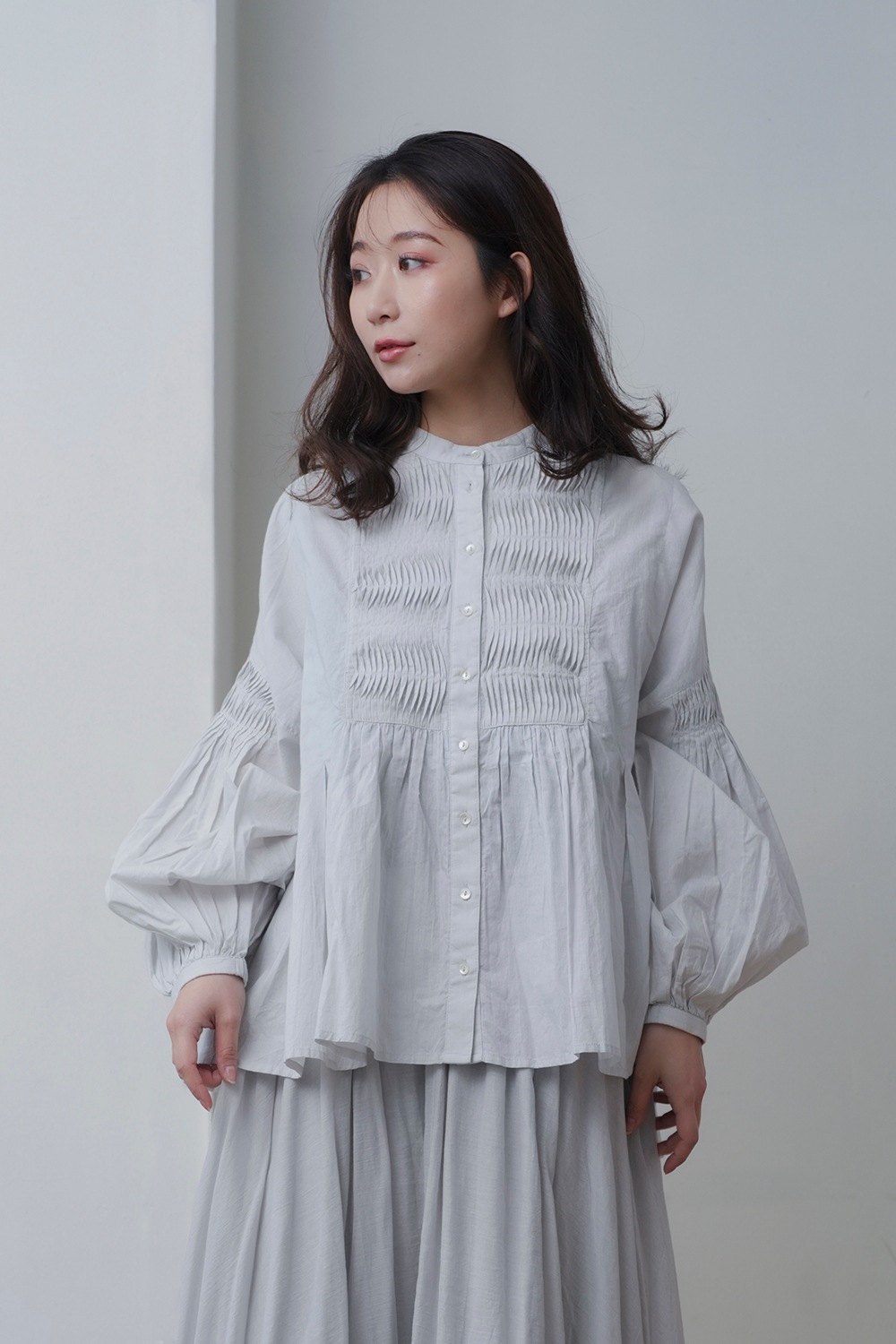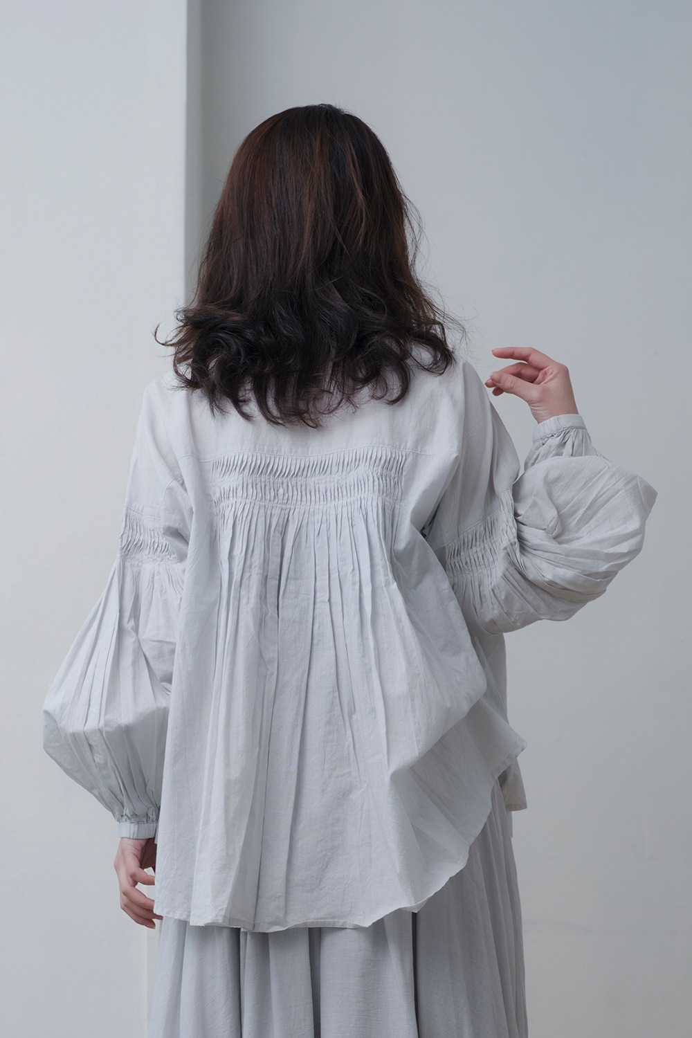 tegamiを象徴するピンタックをアレンジ。綿ボイルの柔らかさを生かし、重なりの多い細やかなピンタックが施されています。また袖口はギャザーゴムを使用しており、ブラウジングすることで袖を(7分袖の)バルーン状のシルエットに変化させ楽しめます。※綿ボイル素材は、特有のシアー(透け)感があります。 着用にはインナーの使用をおすすめします。