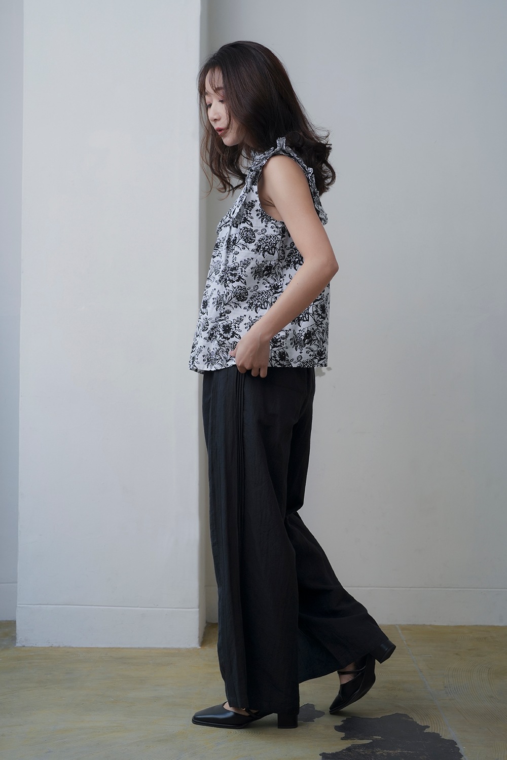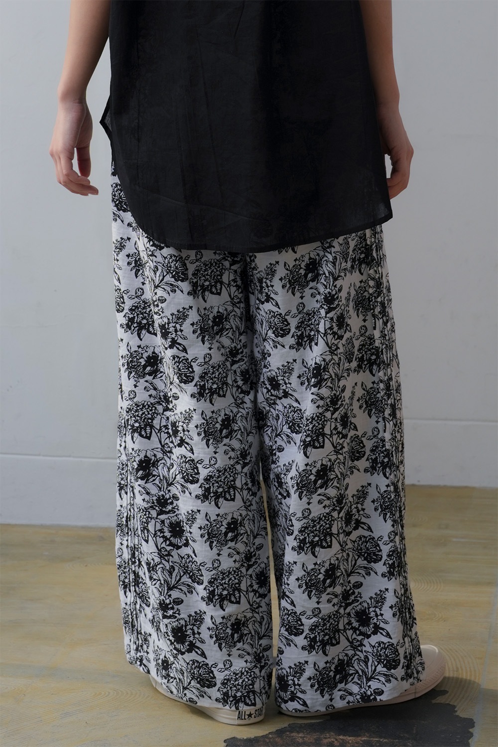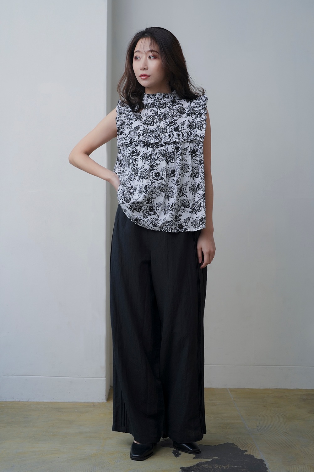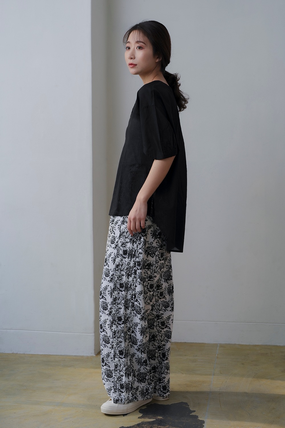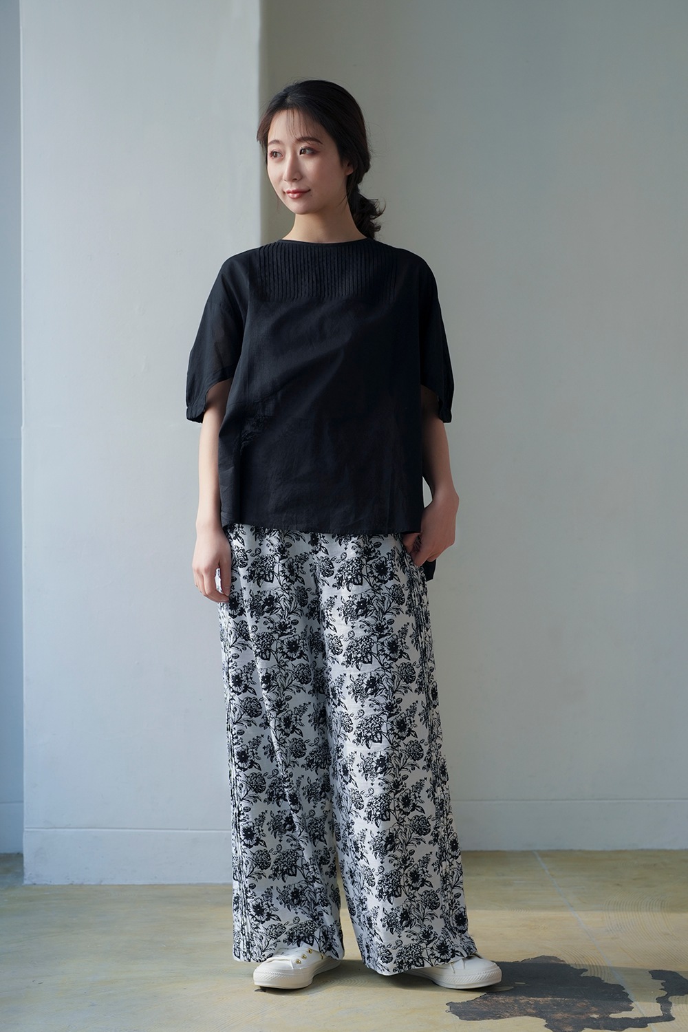 サイドに施されたピンタックが縦のラインを強調し、すっきりとした印象を与えるワイドパンツです。 ゆるやかに広がるシルエットが動きに表情を加え、スタイリングを品よくまとめてくれます。 綿麻素材ならではの柔らかさと軽やかさを併せ持ち、ナチュラルな風合いが魅力です。 リラックス感がありながらも上品な仕上がりで、シーズンを通して快適に着用できます。 ウエストはゴム仕様でフィット感を調整しやすく、長時間の着用でもストレスフリーな履き心地です。 両サイドには便利なポケットを備え、機能性にも優れています。 柄・無地で2本そろえて頂くのもおすすめです。