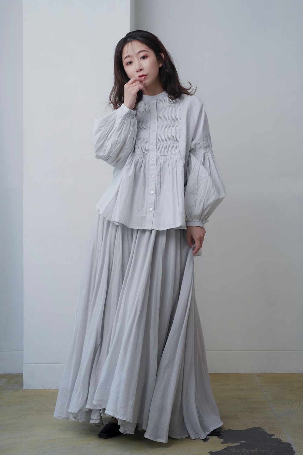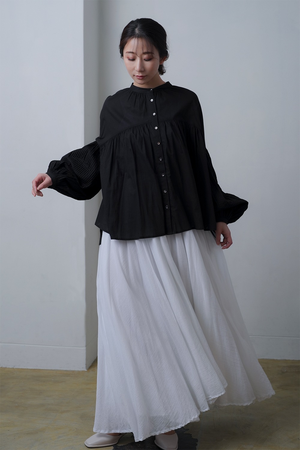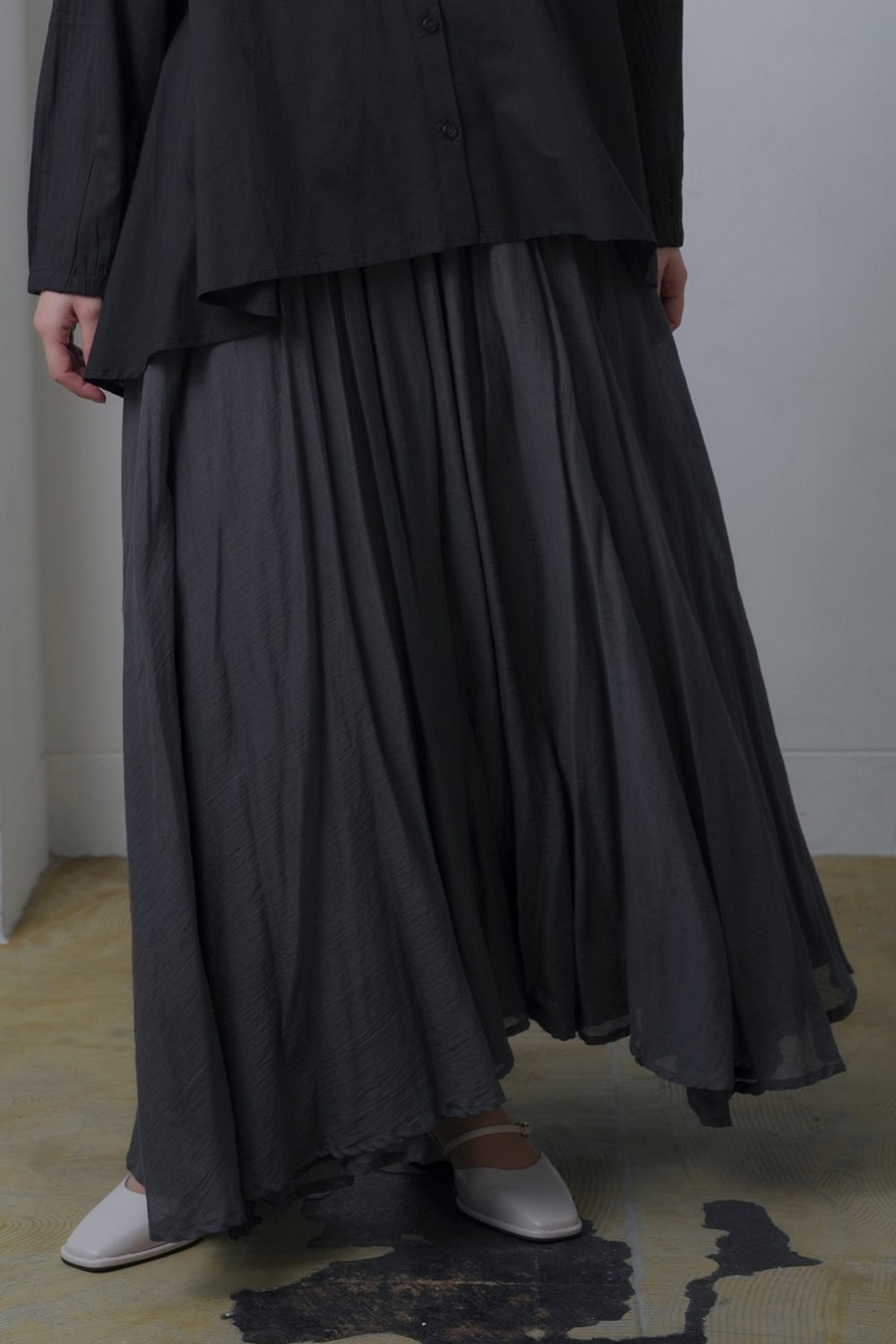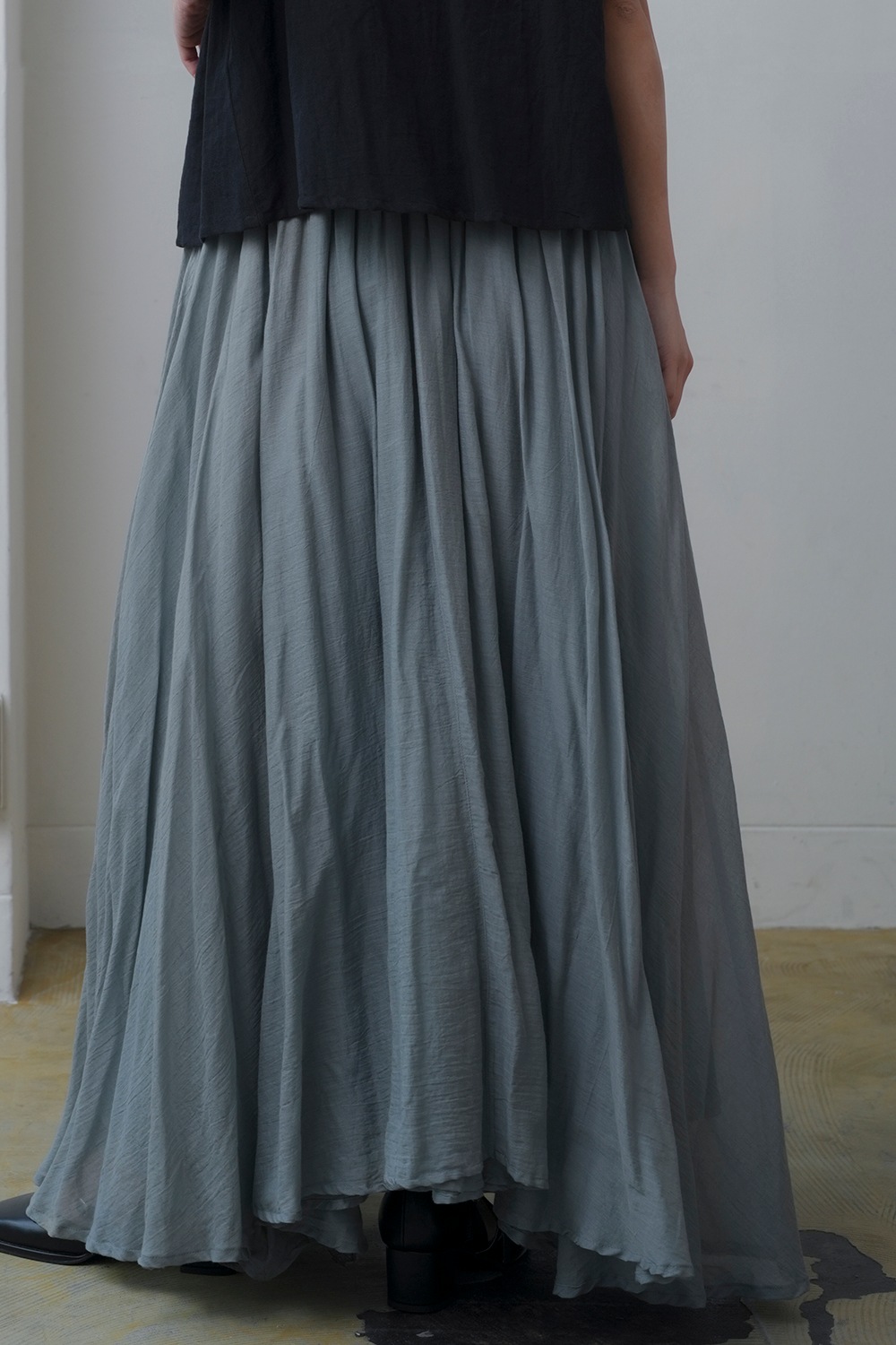 たっぷりと広がるフレアーラインが魅力のサーキュラースカート ドラマティックなボリュームシルエットが特徴のサーキュラースカート。 細かく入れたギャザーがふんわりと広がり、歩くたびに優雅な動きを演出します。 腰回りはすっきりと仕上げつつ、裾にかけて存分に広がるシルエットが美しく、どの角度から見ても印象的なデザインです。 軽やかなコットン素材を使用し、風をはらむような柔らかいドレープが楽しめます。 肌当たりの良い生地感で、一日中快適な着心地を実現。ナチュラルな風合いを活かしつつ、適度なハリ感を持たせることで、スカートの立体的なフォルムを美しくキープします。 ウエストは総ゴム仕様でストレスフリーな履き心地。 内側にドローコードを施し、お好みのフィット感に調整可能。歩くたびにふんわりと広がるシルエットながら、ウエスト周りはすっきりと見せる計算されたバランスで、スタイルアップ効果も期待できます。 3枚重ねの豪華な装いでカジュアルにもフォーマルにも、幅広いニーズにお応えします。