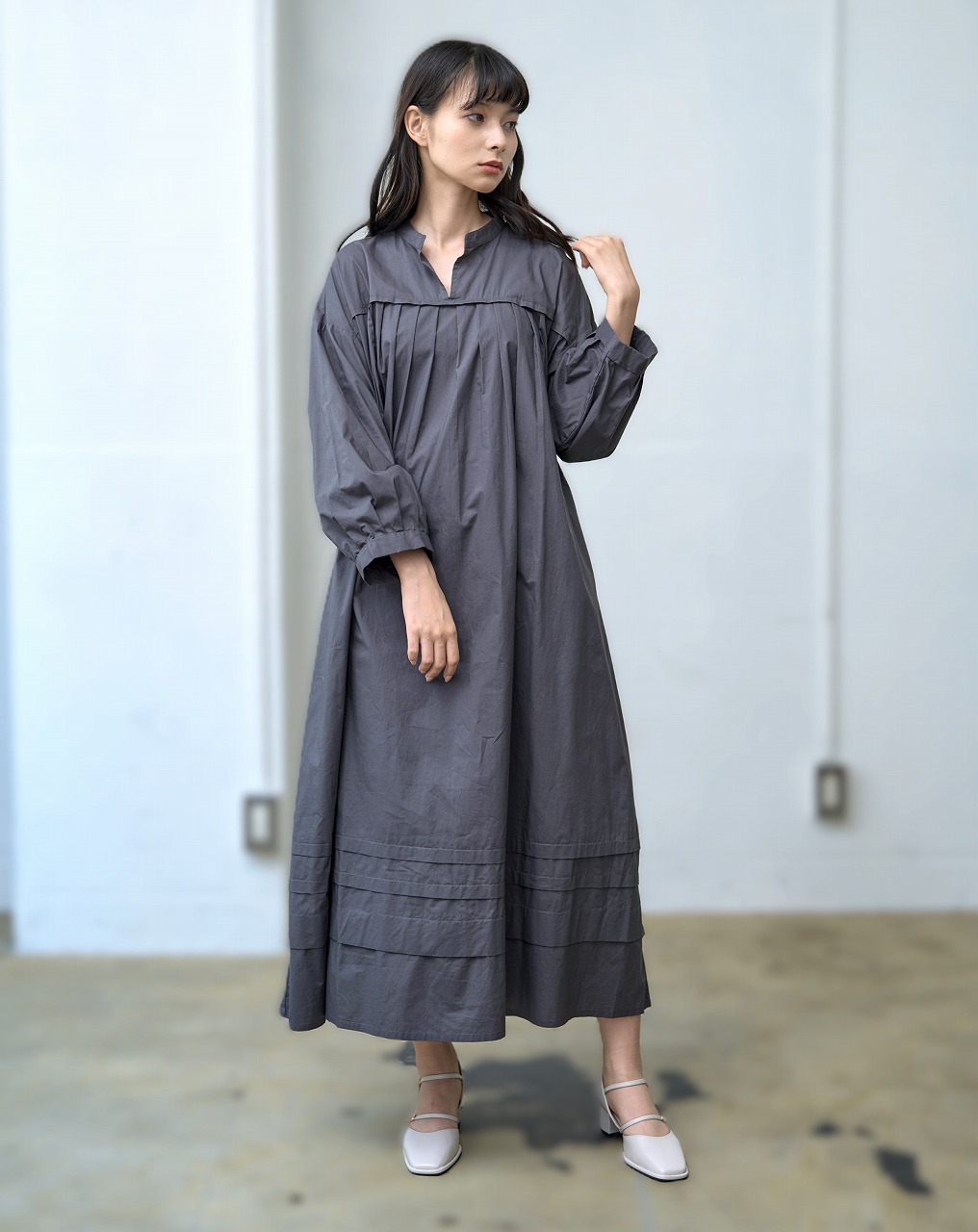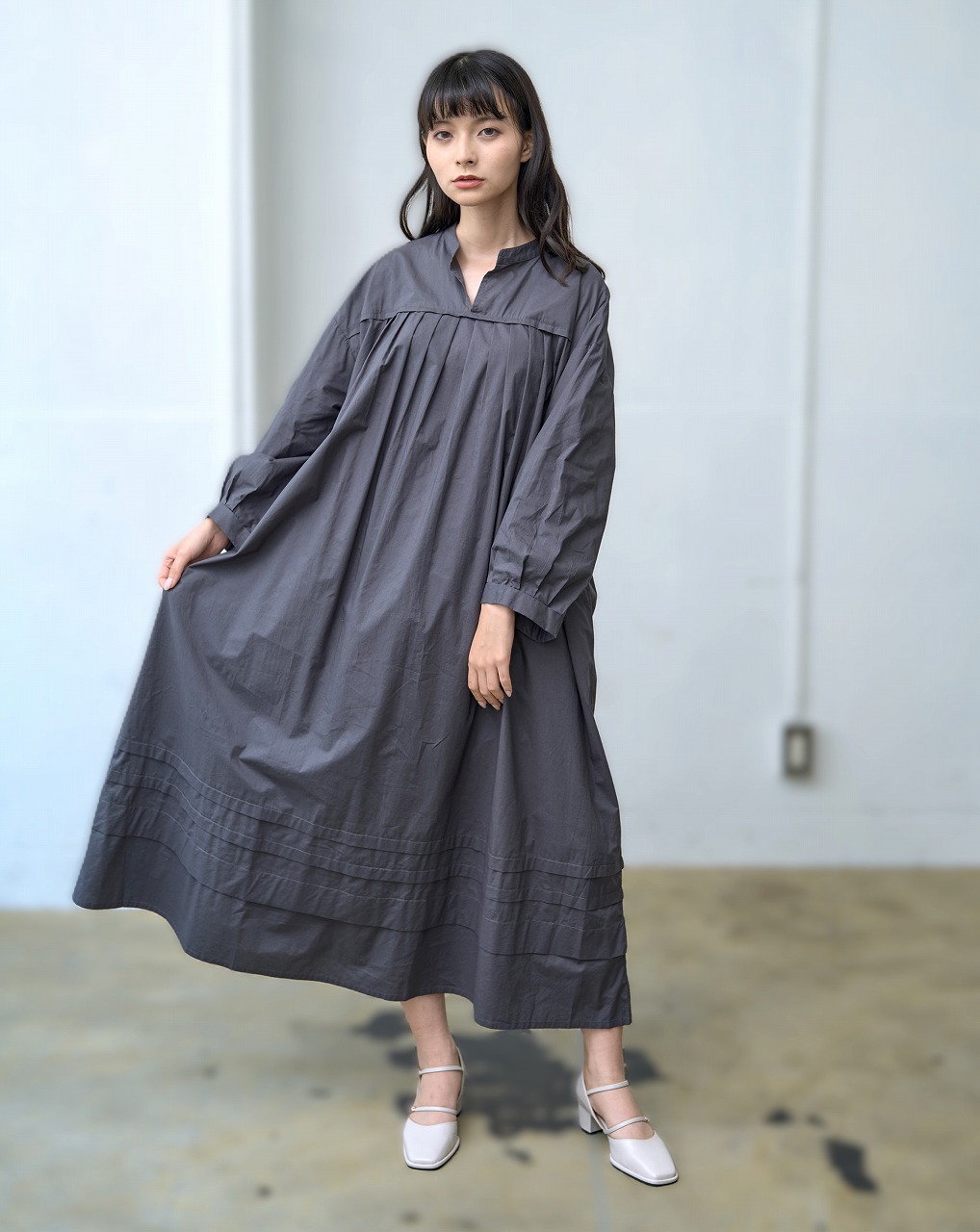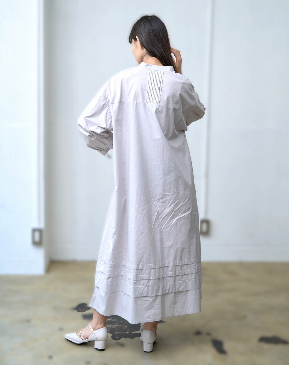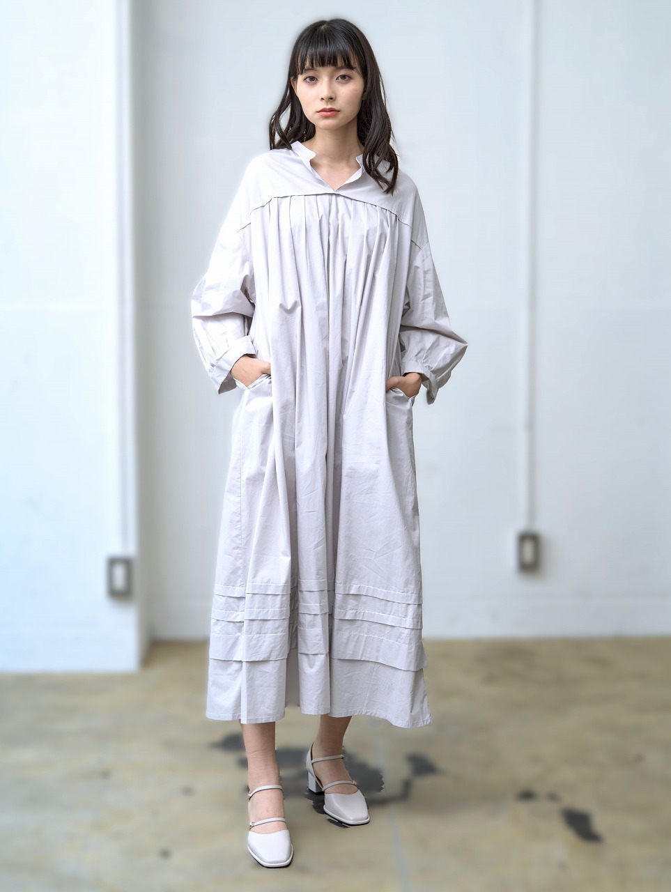 胸元切替で等間隔に並んだタックがアクセントになったロングワンピース。 直線的な構成ながら、空気を含んだAラインシルエットが動きと奥行きを演出。 袖のタックテクニックで大人っぽい可愛さをプラスしています。 綿の柔らかさとハリ感を備えた生地なのでモードに、ナチュラルに着用できます。