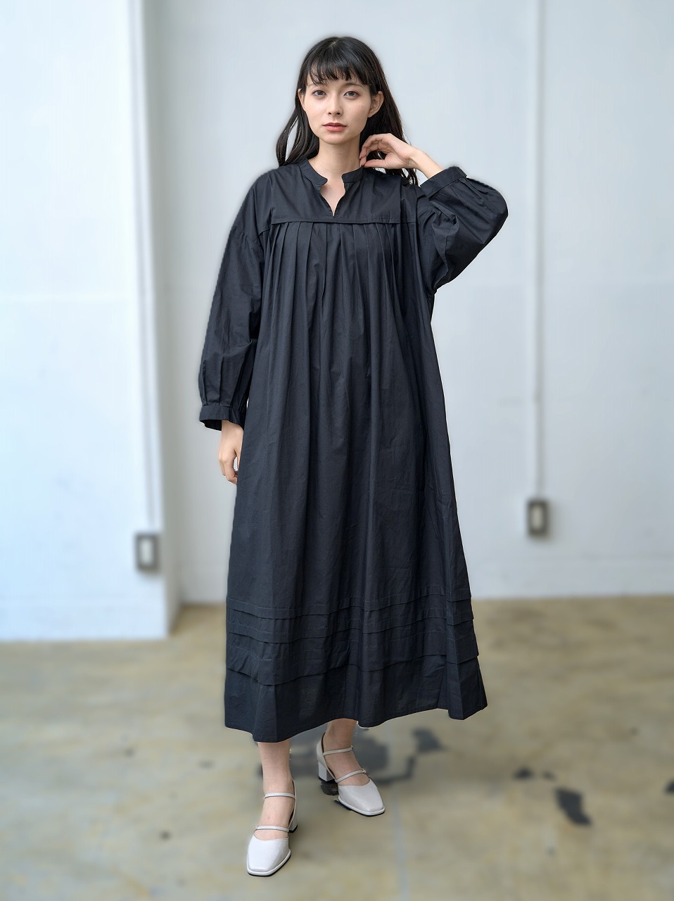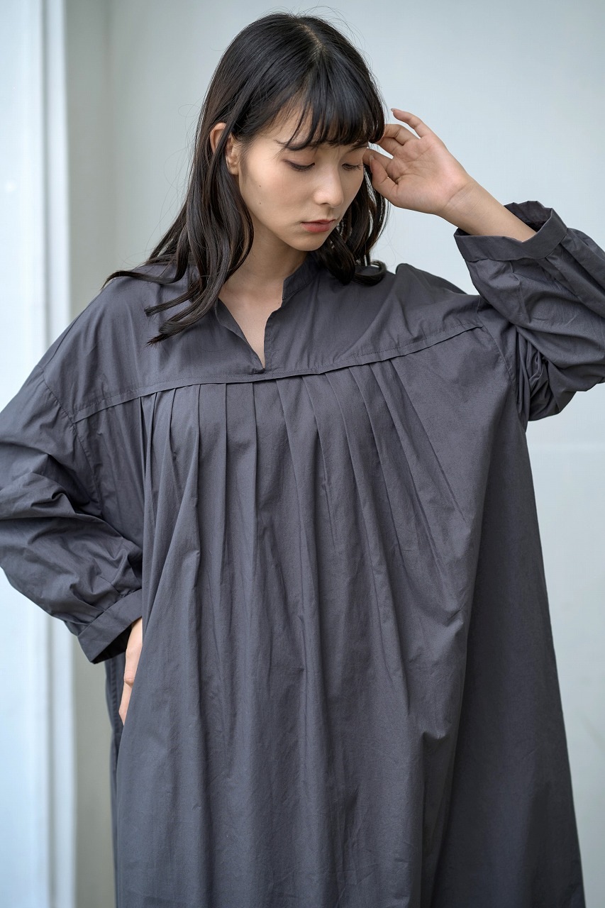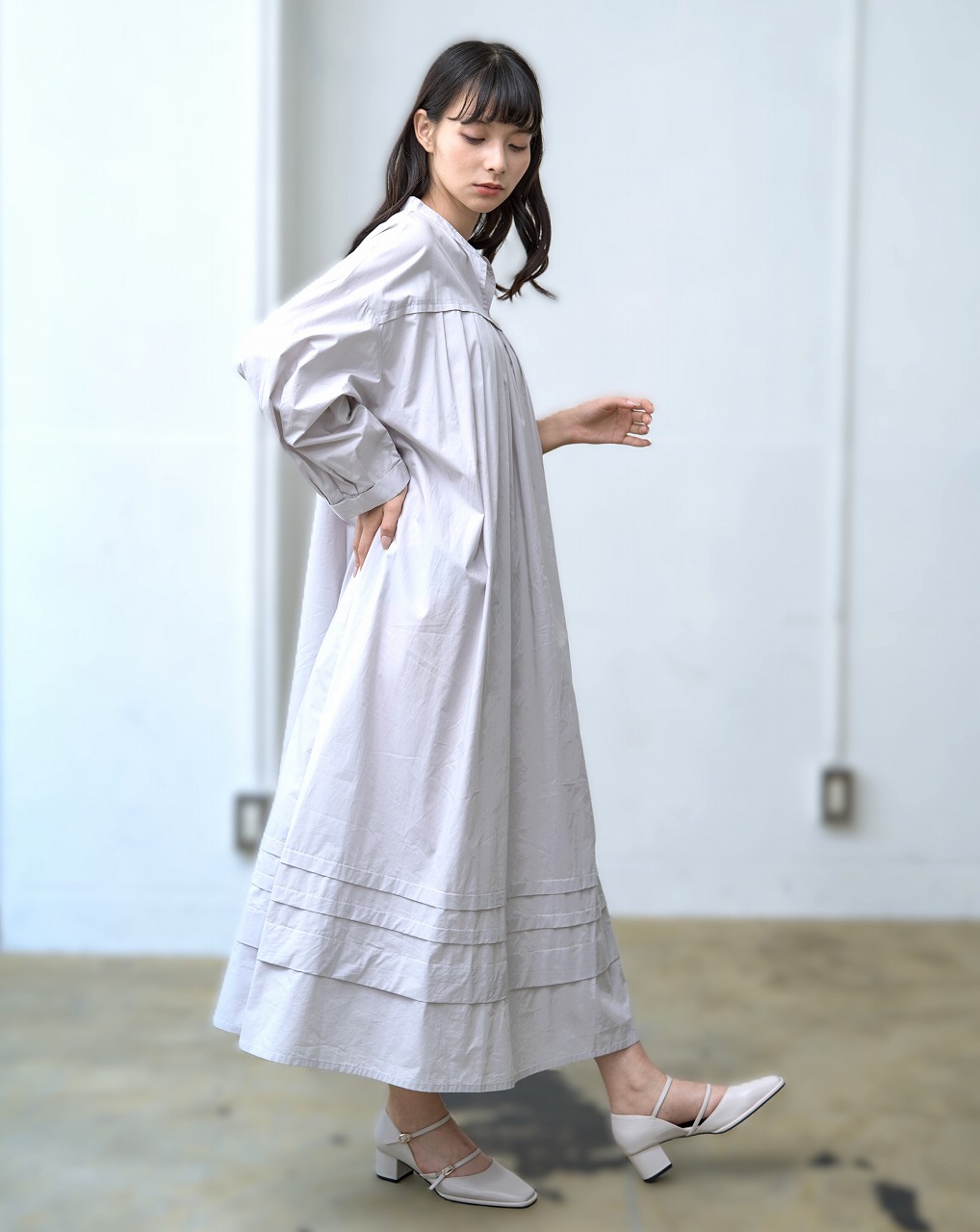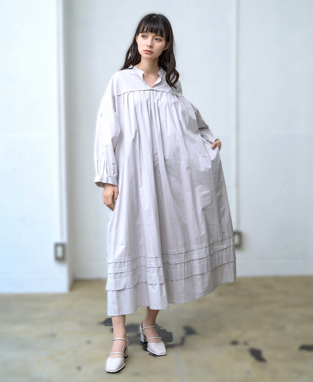 胸元切替で等間隔に並んだタックがアクセントになったロングワンピース。 直線的な構成ながら、空気を含んだAラインシルエットが動きと奥行きを演出。 袖のタックテクニックで大人っぽい可愛さをプラスしています。 綿の柔らかさとハリ感を備えた生地なのでモードに、ナチュラルに着用できます。