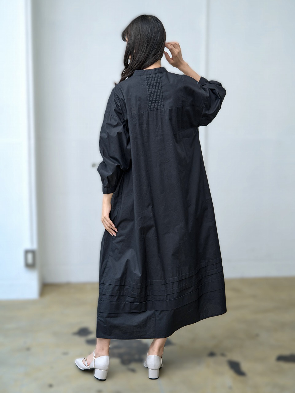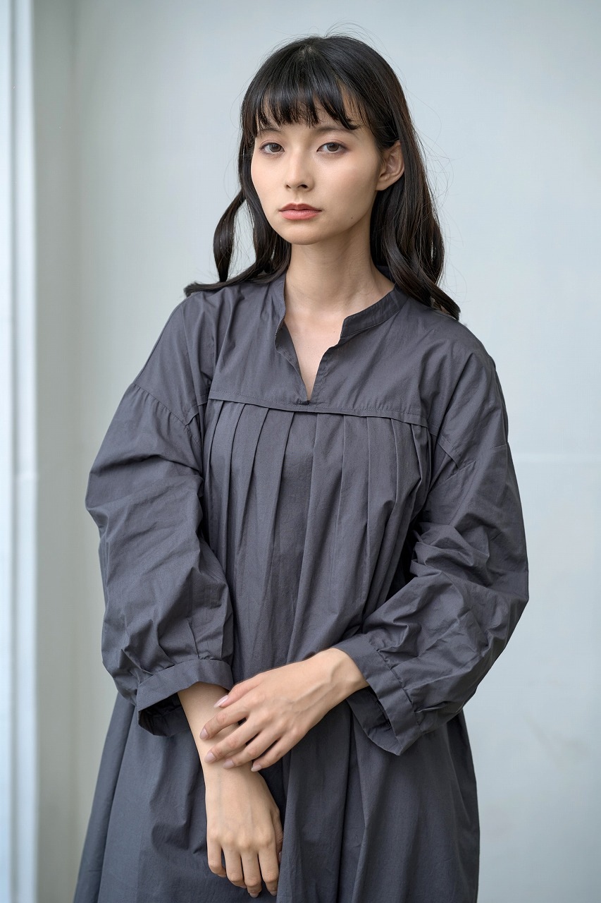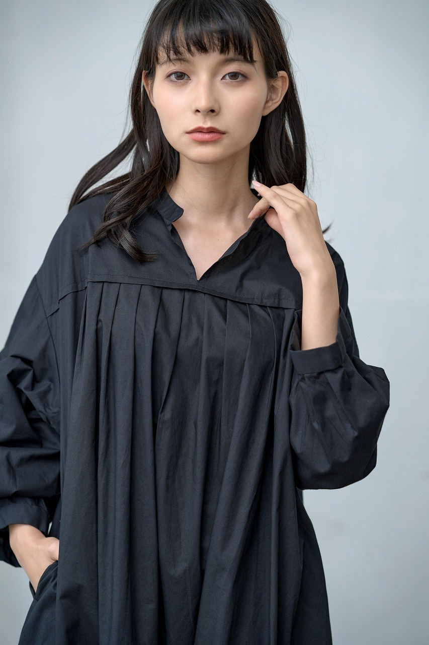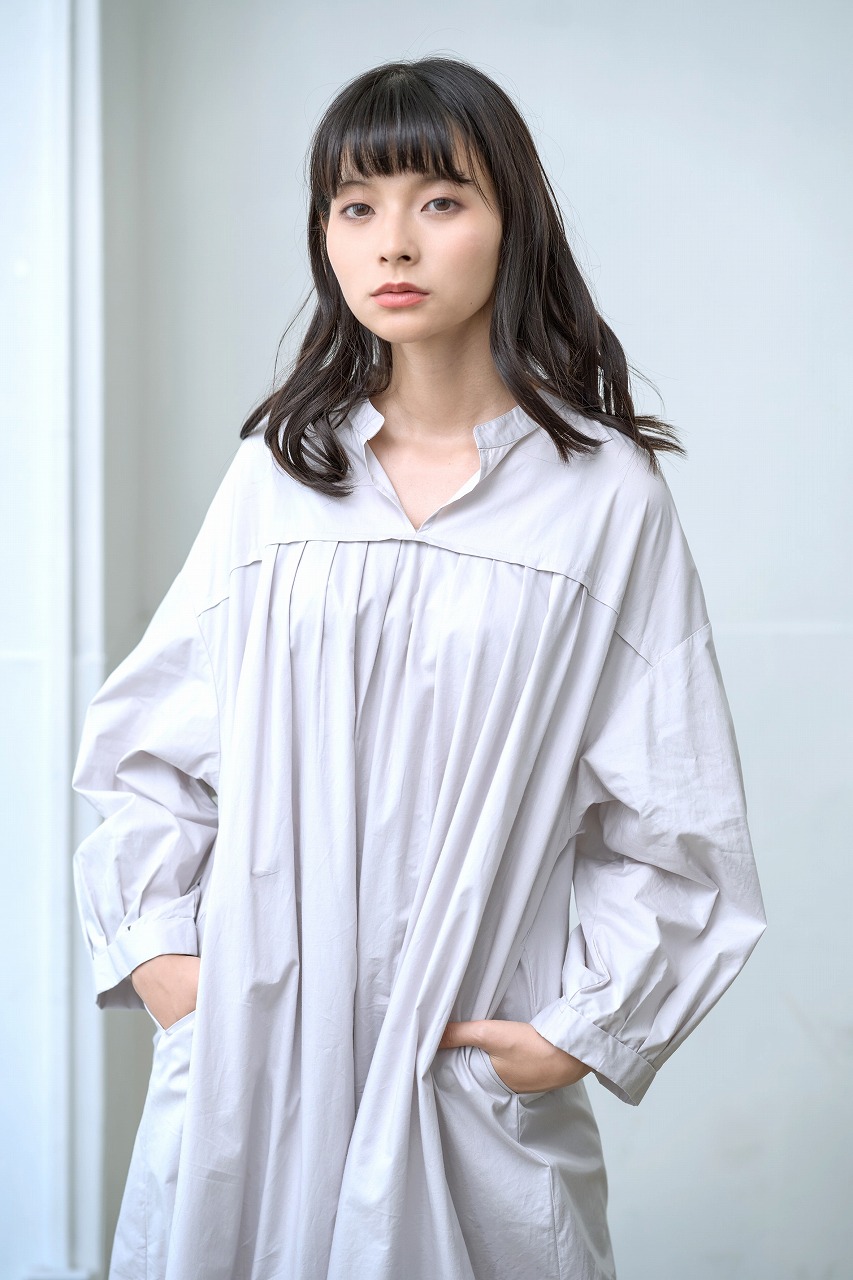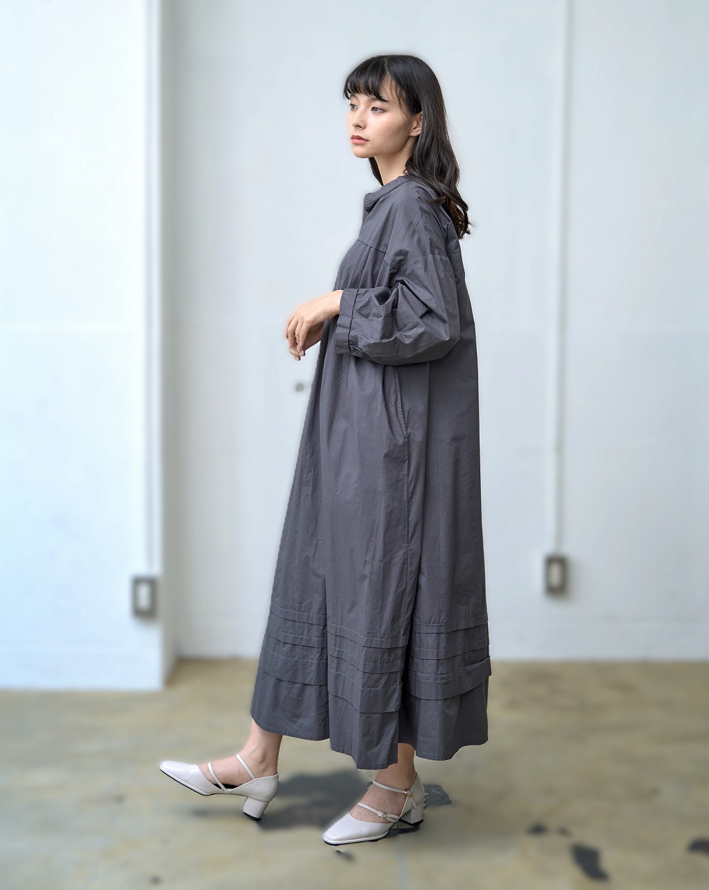 胸元切替で等間隔に並んだタックがアクセントになったロングワンピース。 直線的な構成ながら、空気を含んだAラインシルエットが動きと奥行きを演出。 袖のタックテクニックで大人っぽい可愛さをプラスしています。 綿の柔らかさとハリ感を備えた生地なのでモードに、ナチュラルに着用できます。