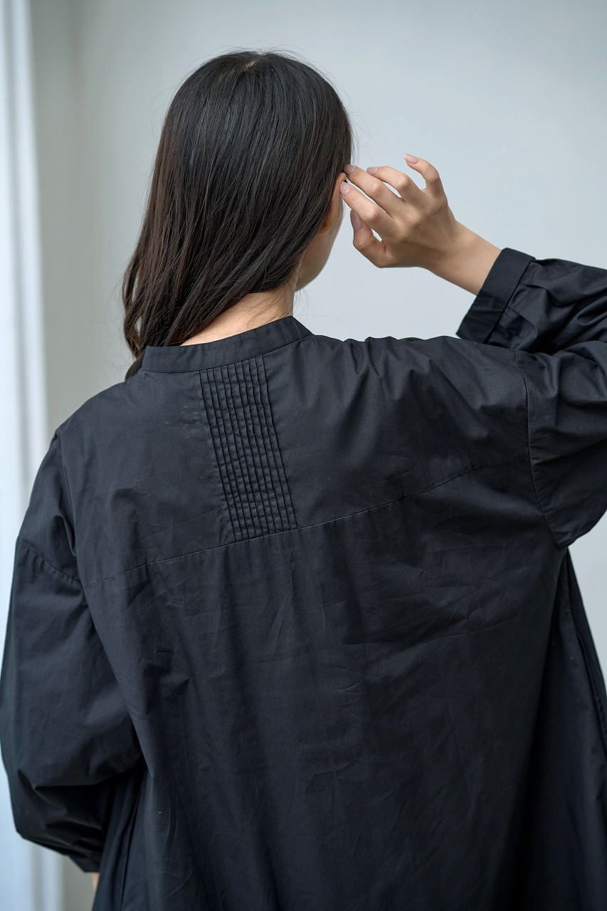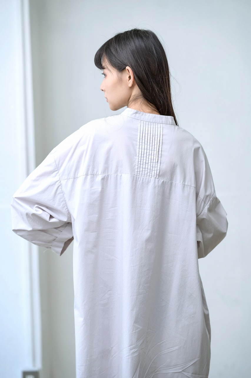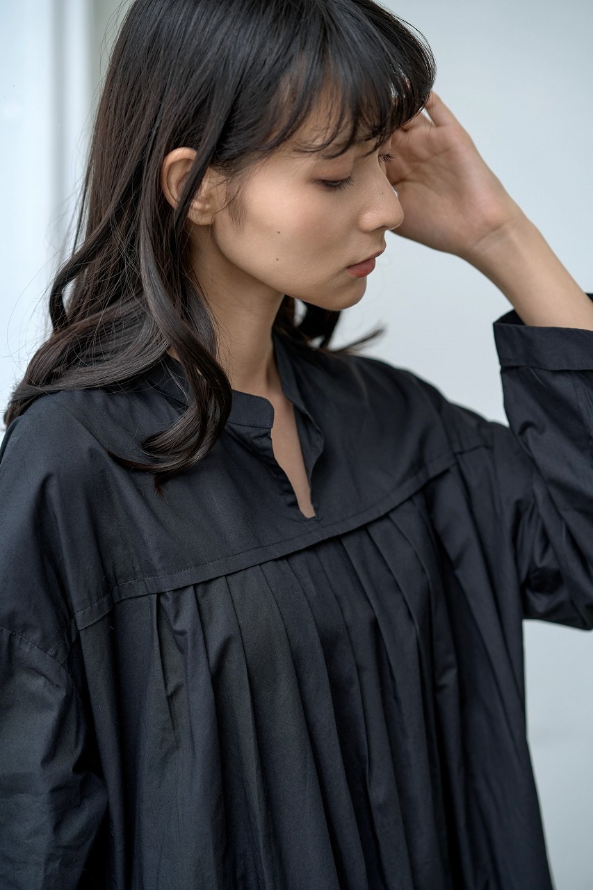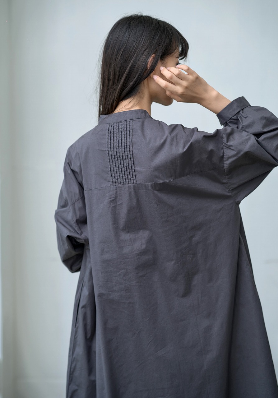 胸元切替で等間隔に並んだタックがアクセントになったロングワンピース。 直線的な構成ながら、空気を含んだAラインシルエットが動きと奥行きを演出。 袖のタックテクニックで大人っぽい可愛さをプラスしています。 綿の柔らかさとハリ感を備えた生地なのでモードに、ナチュラルに着用できます。