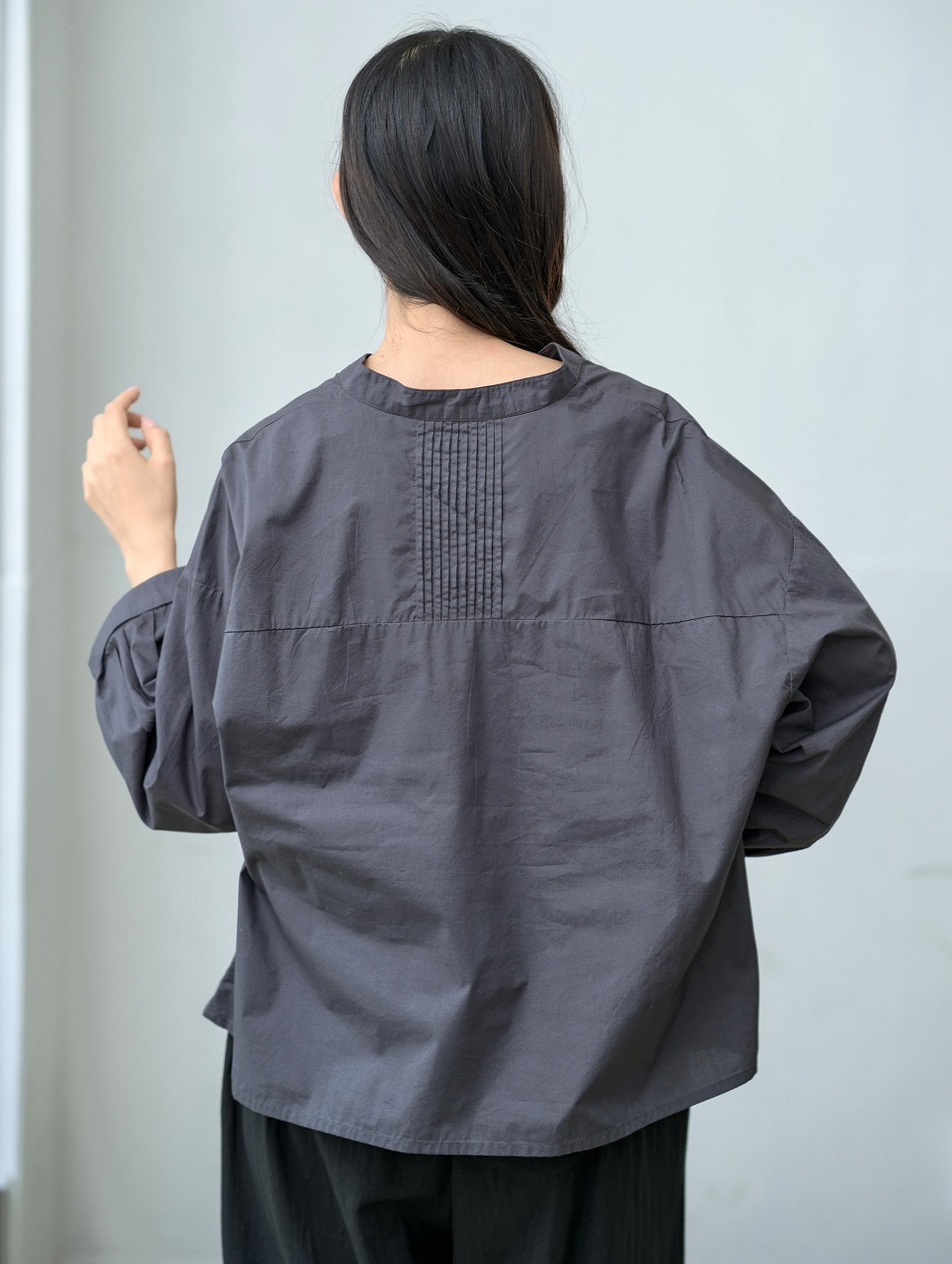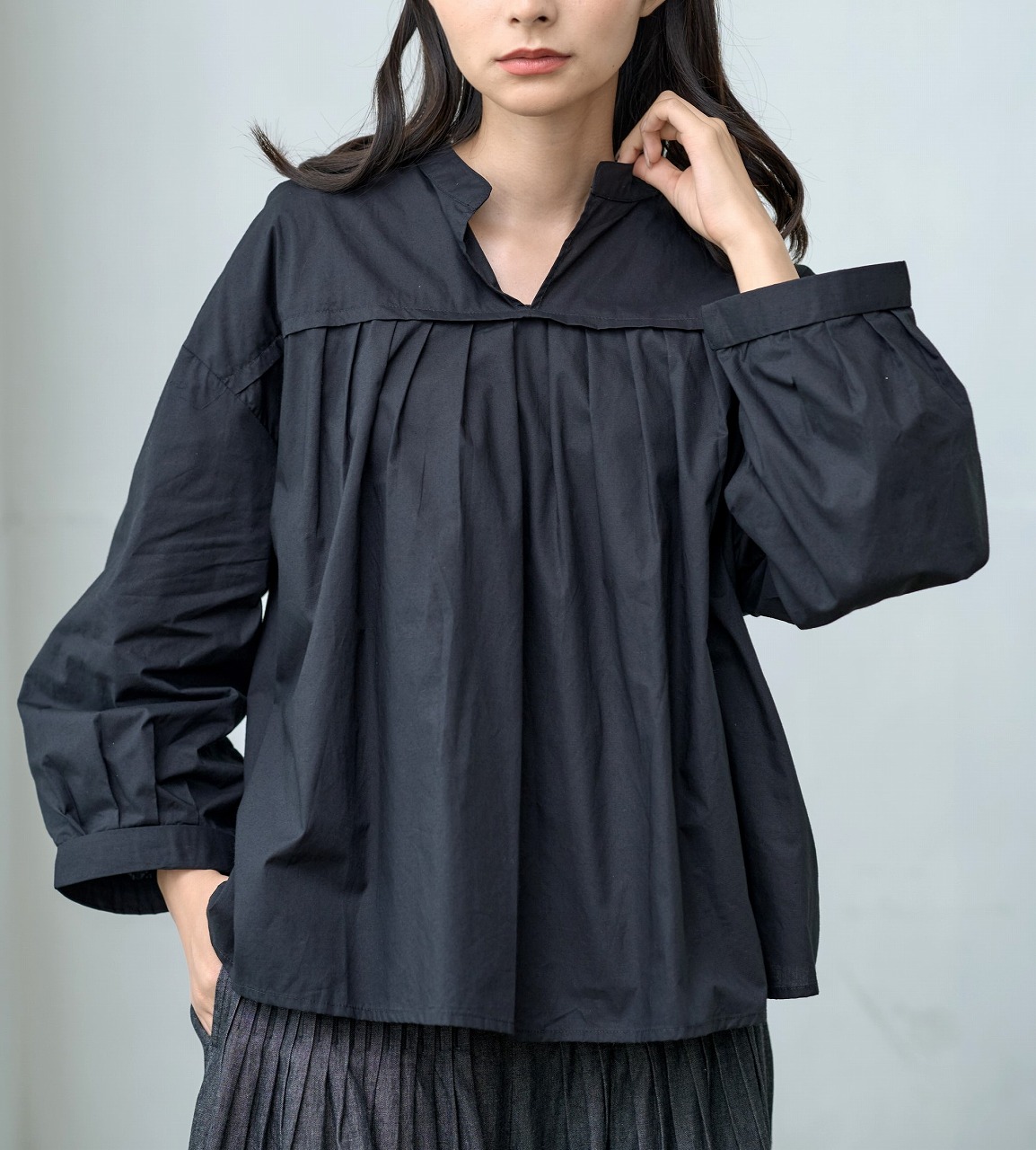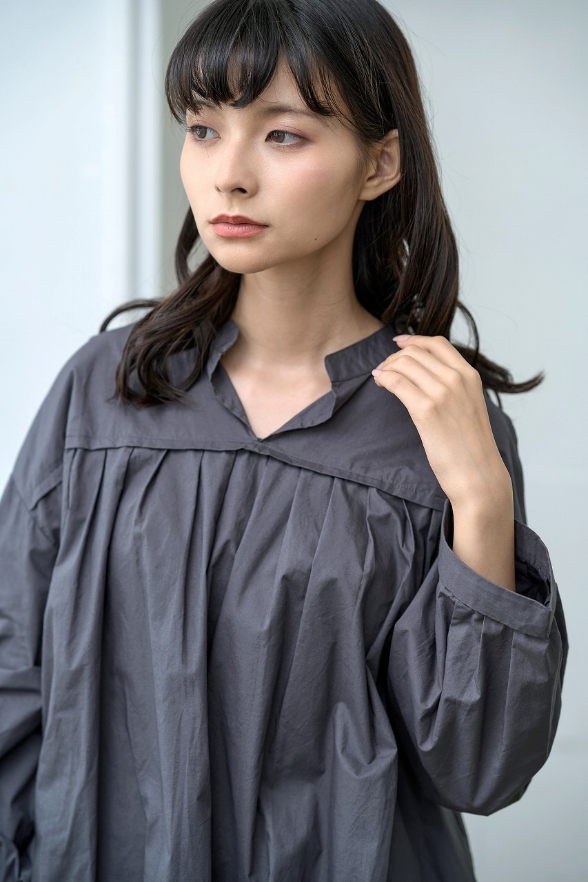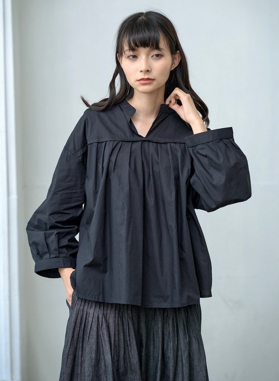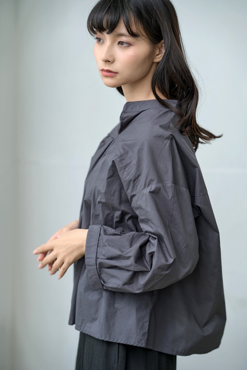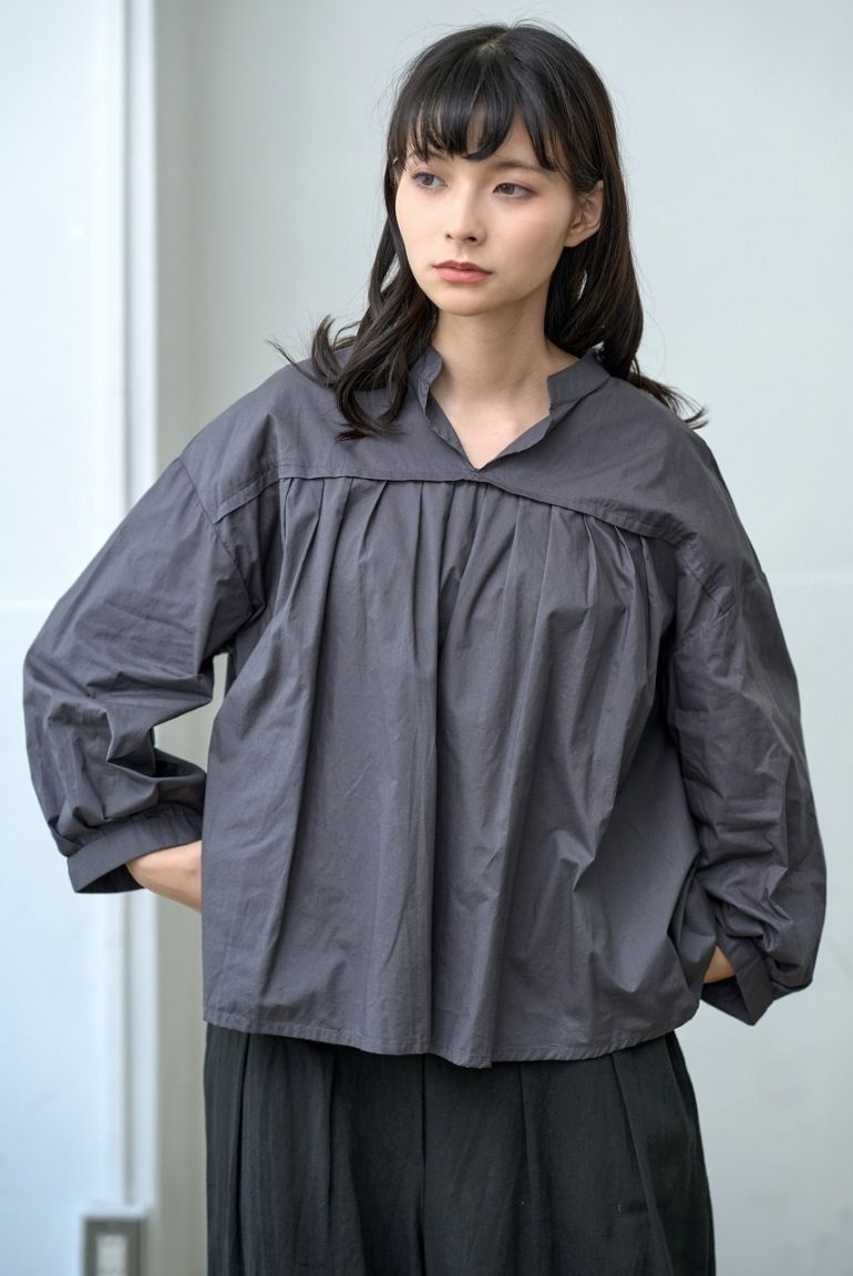 胸元切替で等間隔に並んだタックがアクセントになったブラウス。 スタンドカラーと控えめな前開きが端正な印象を与えつつ、ふわっとした袖と裾の切り替えが柔らかさを添えます。 普段使いしやすいシルエットでありながら、細部のタックディテールが一枚でも様になる仕上がりに。 パンツにもスカートにも相性がよく、季節を問わず着回しの効く万能トップスです。