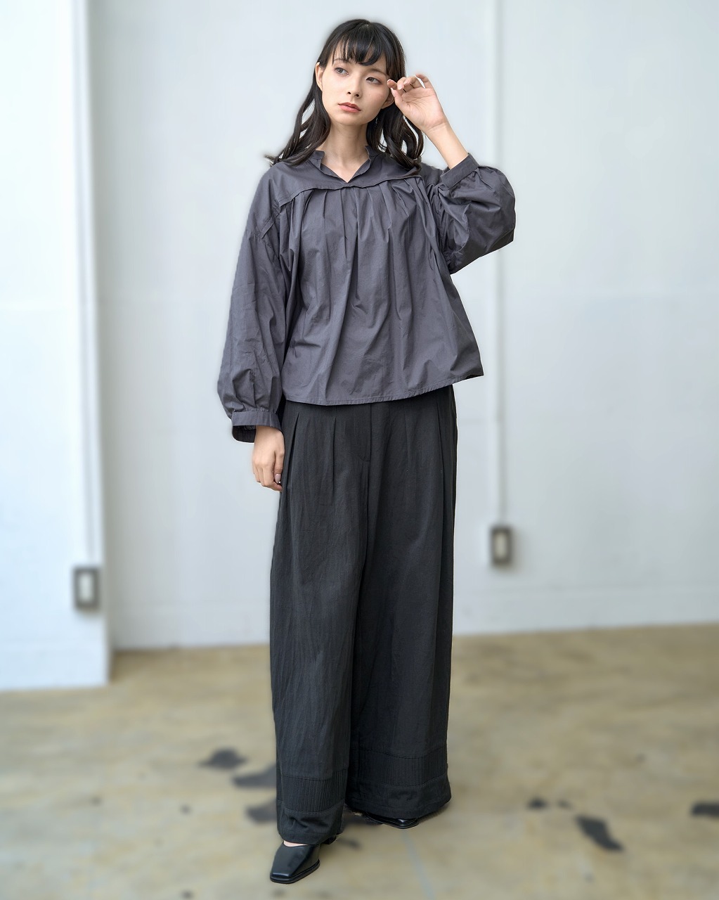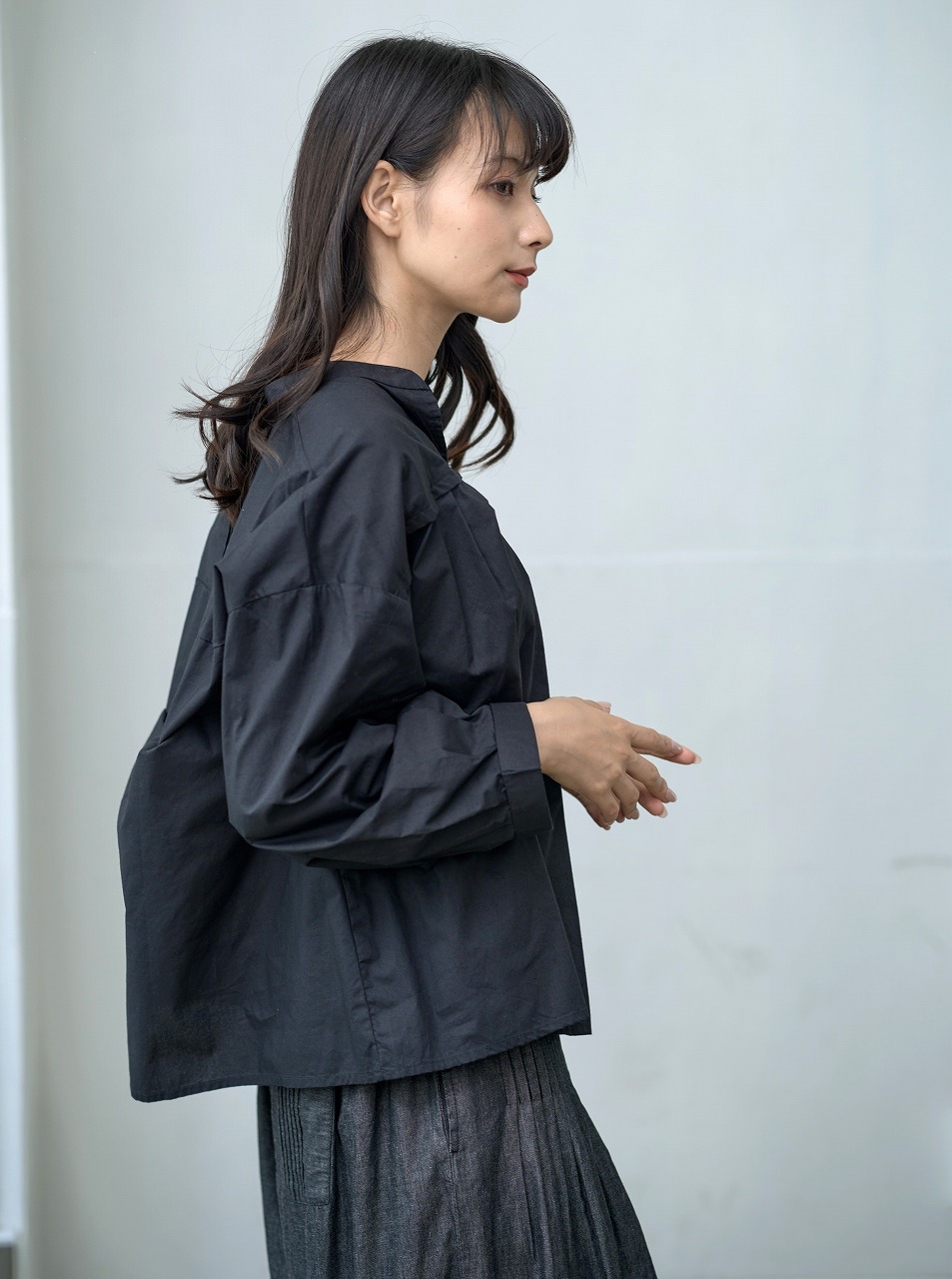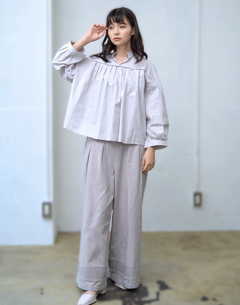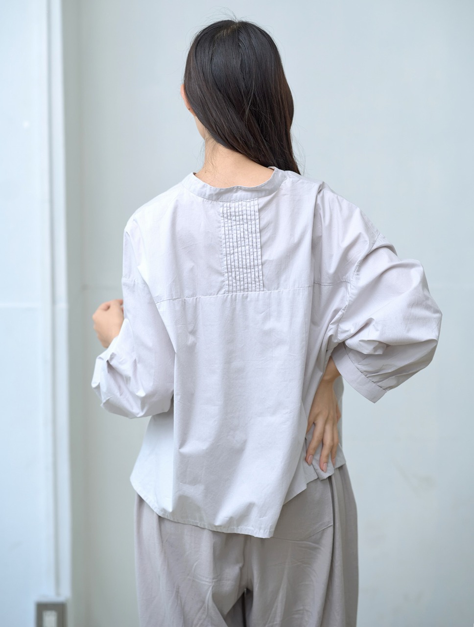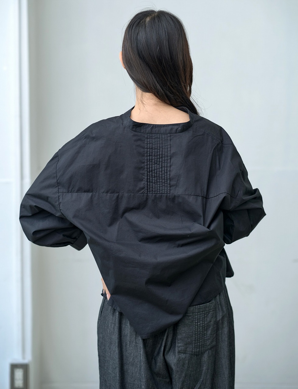 胸元切替で等間隔に並んだタックがアクセントになったブラウス。 スタンドカラーと控えめな前開きが端正な印象を与えつつ、ふわっとした袖と裾の切り替えが柔らかさを添えます。 普段使いしやすいシルエットでありながら、細部のタックディテールが一枚でも様になる仕上がりに。 パンツにもスカートにも相性がよく、季節を問わず着回しの効く万能トップスです。