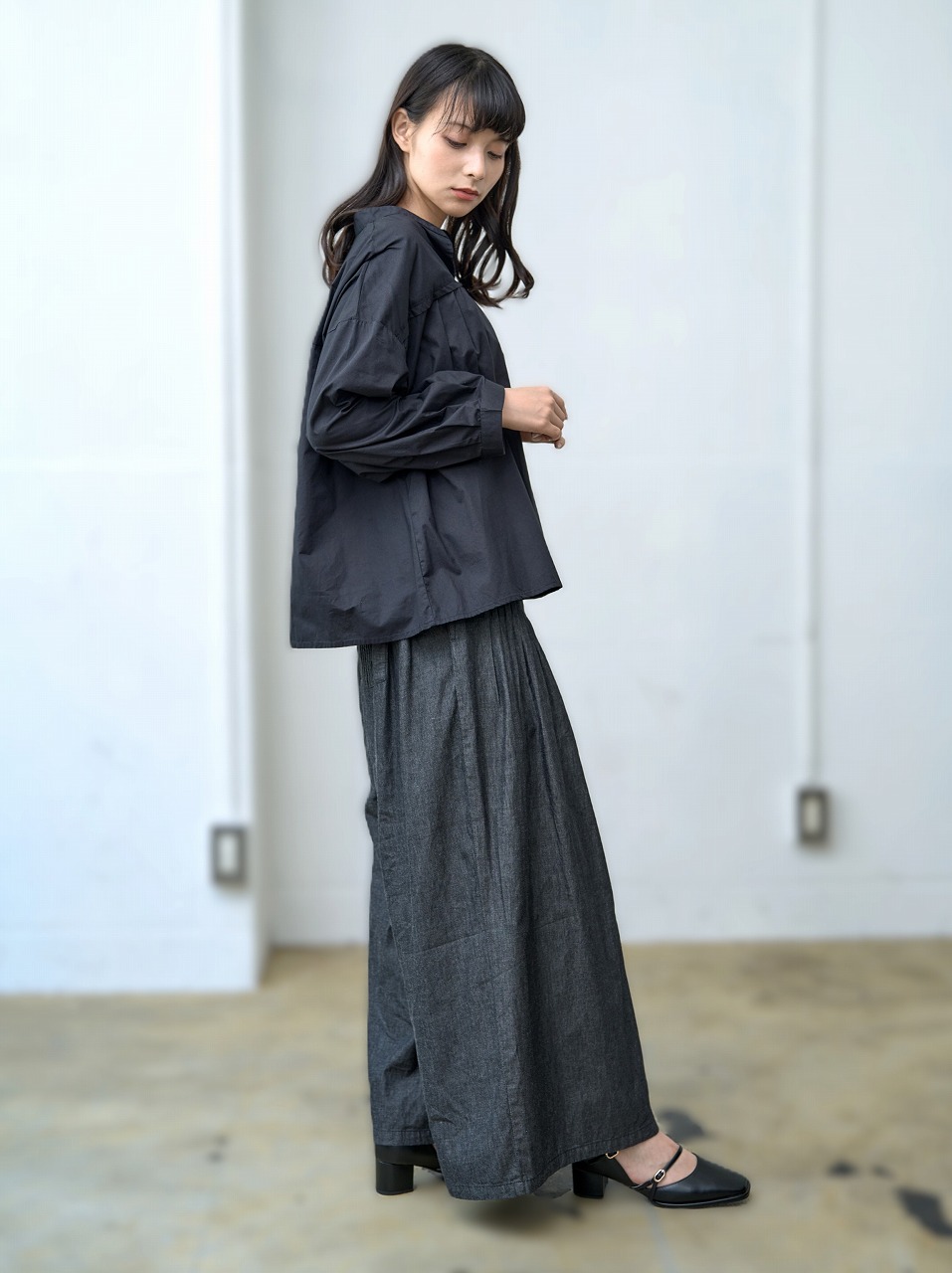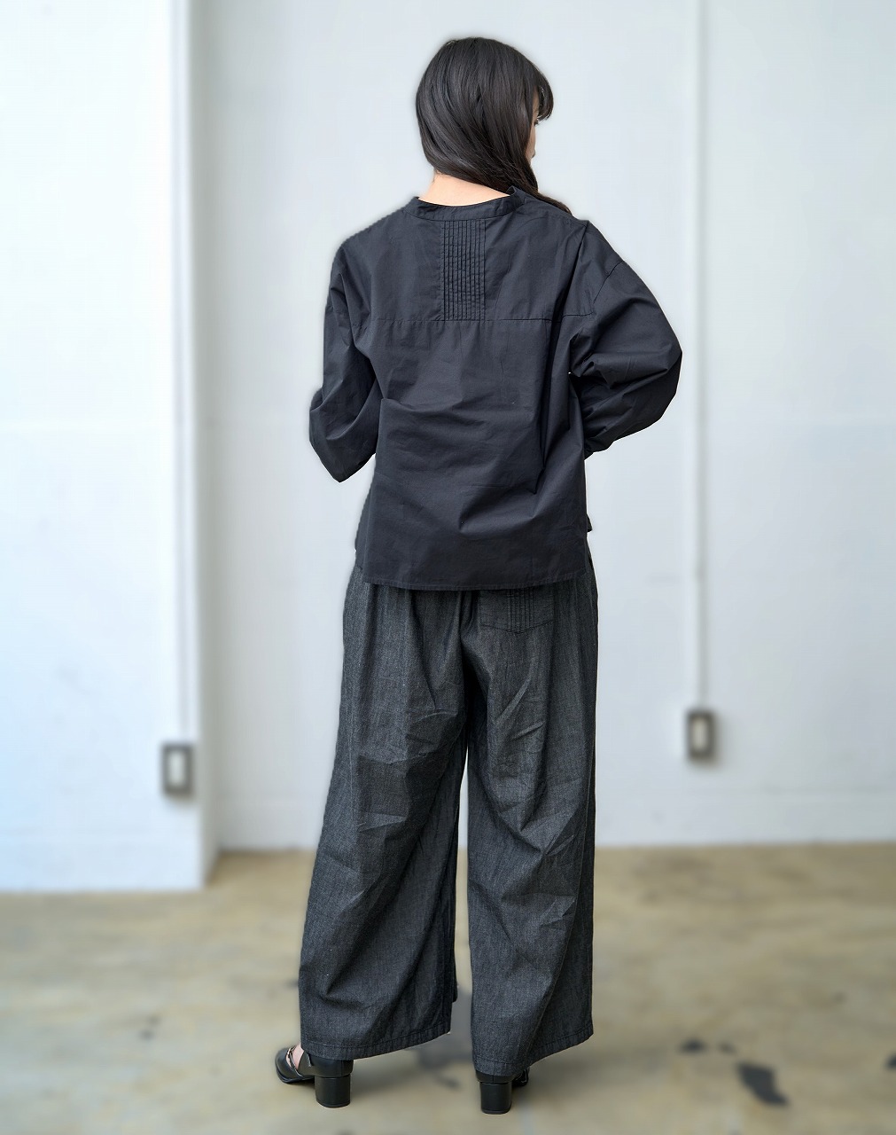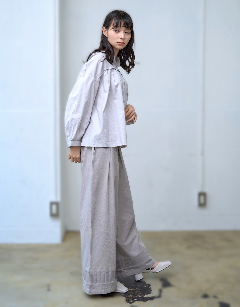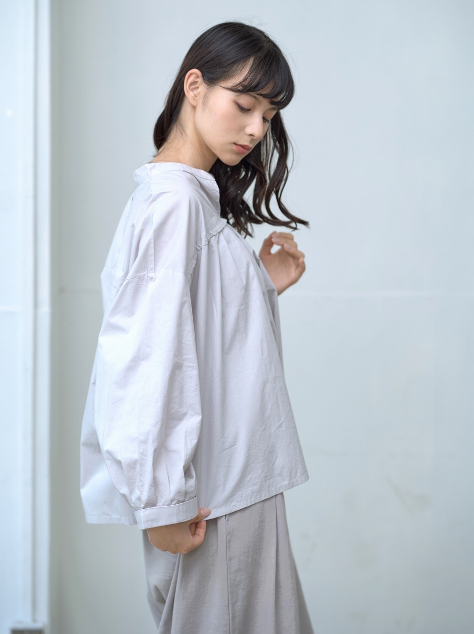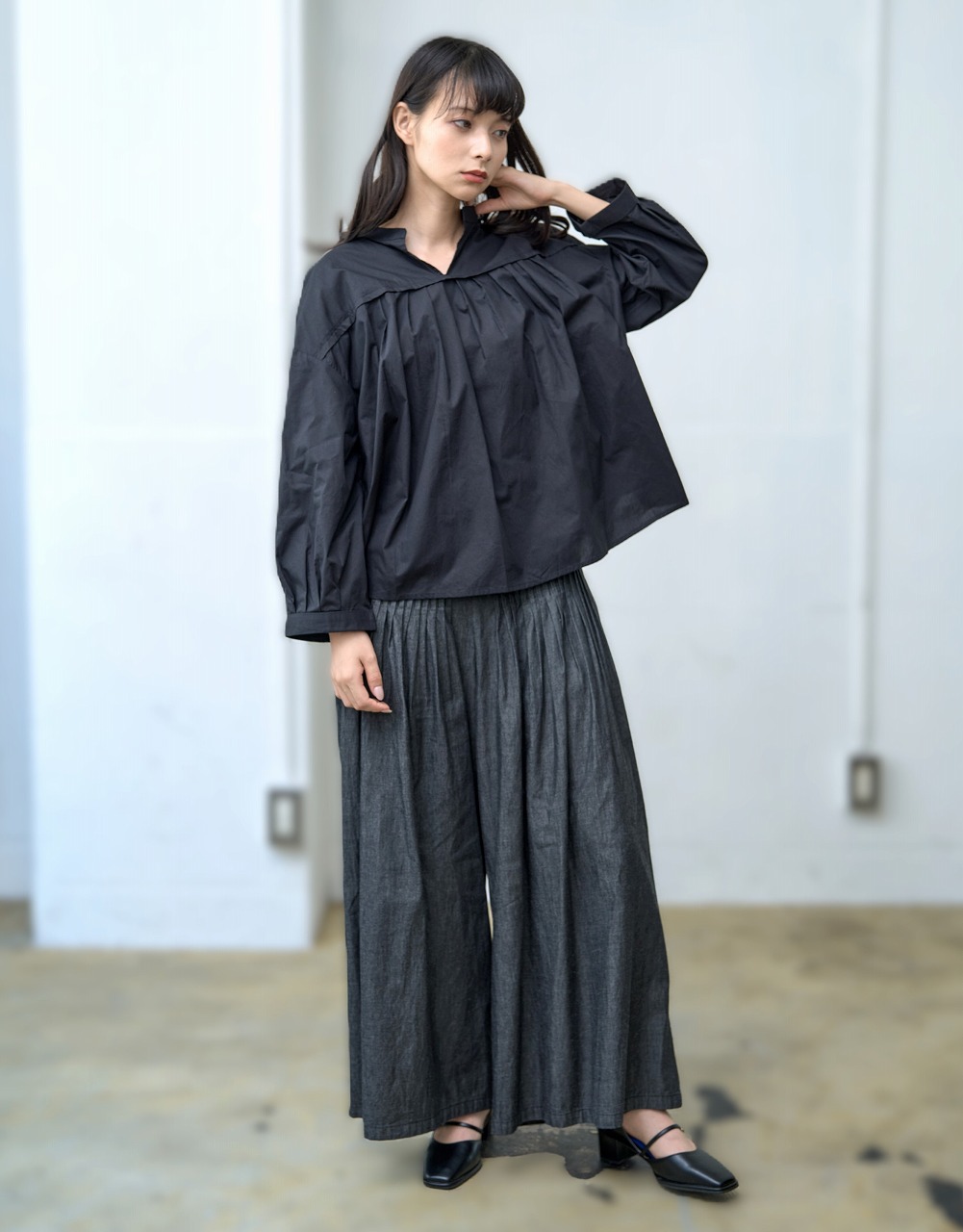胸元切替で等間隔に並んだタックがアクセントになったブラウス。 スタンドカラーと控えめな前開きが端正な印象を与えつつ、ふわっとした袖と裾の切り替えが柔らかさを添えます。 普段使いしやすいシルエットでありながら、細部のタックディテールが一枚でも様になる仕上がりに。 パンツにもスカートにも相性がよく、季節を問わず着回しの効く万能トップスです。