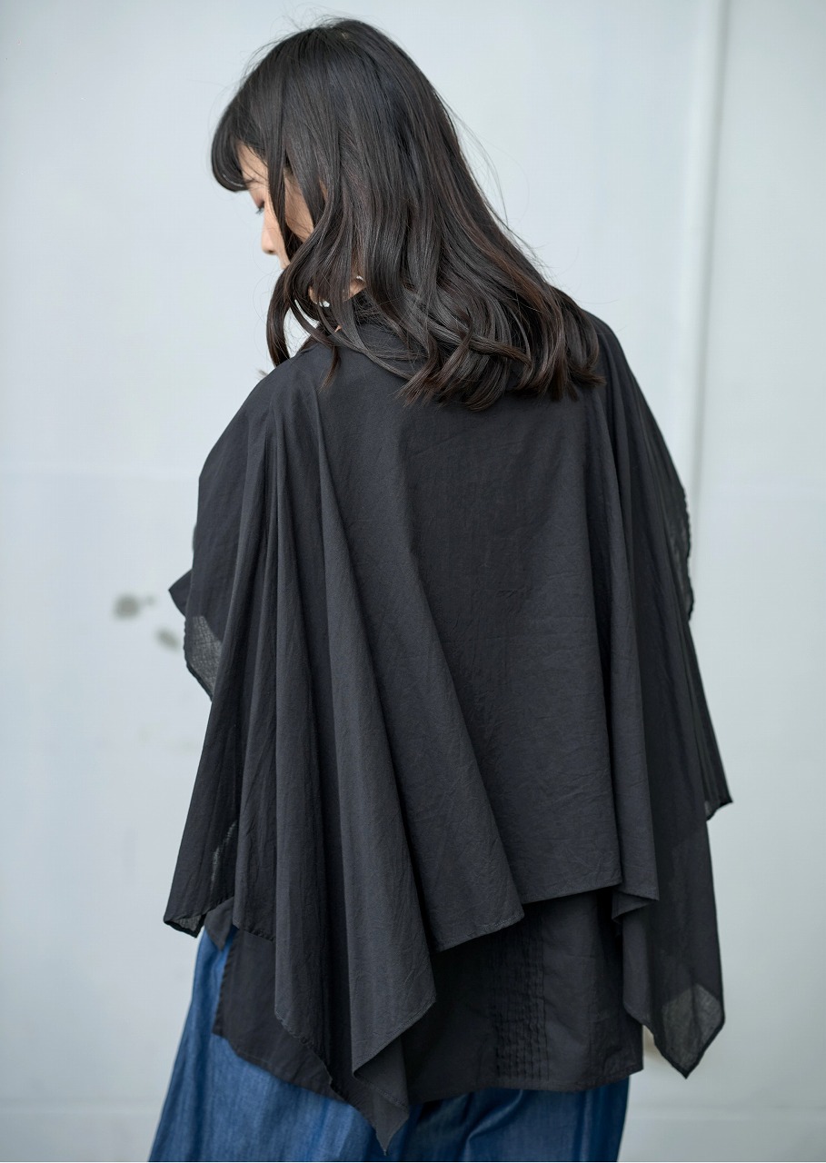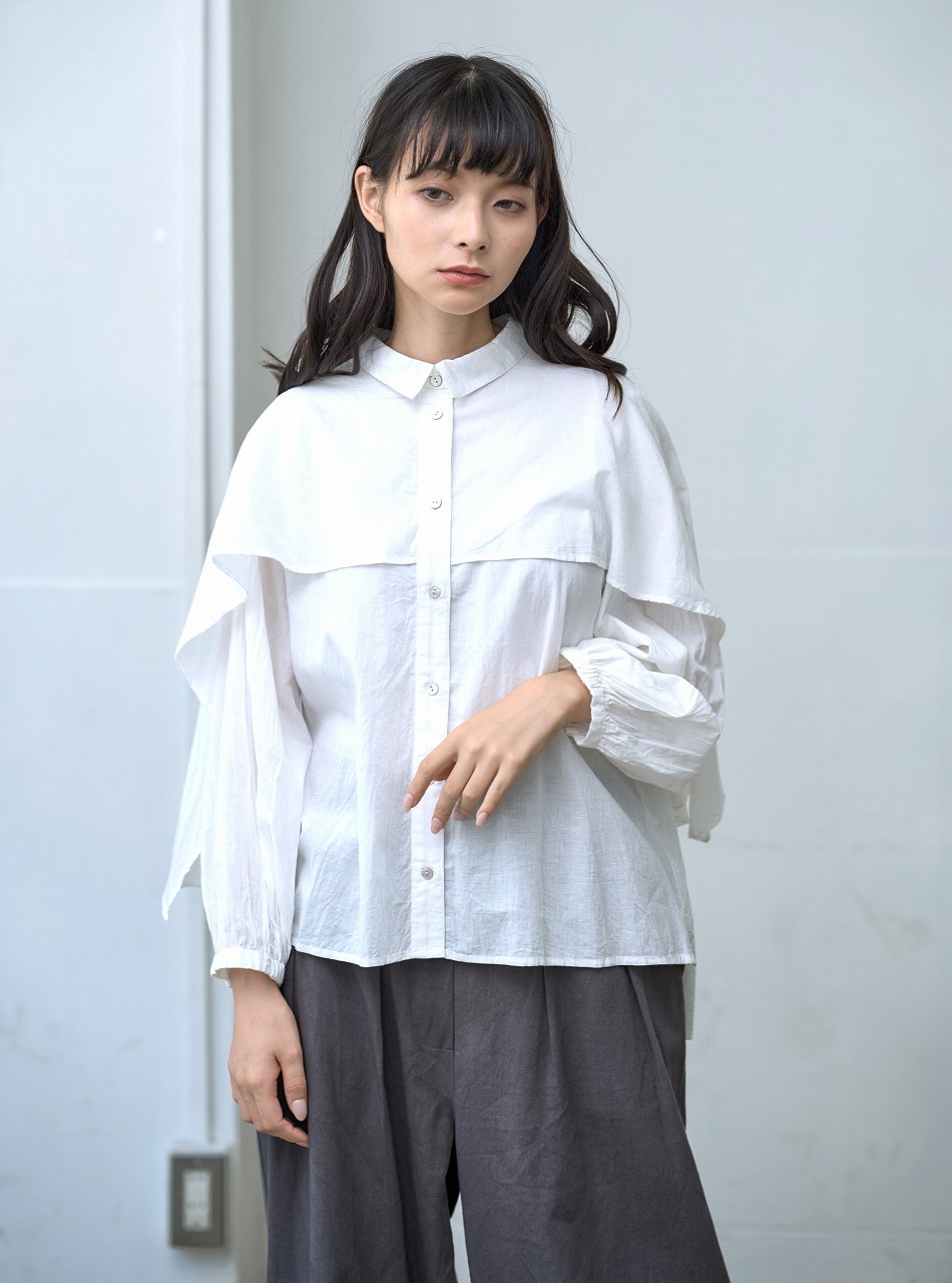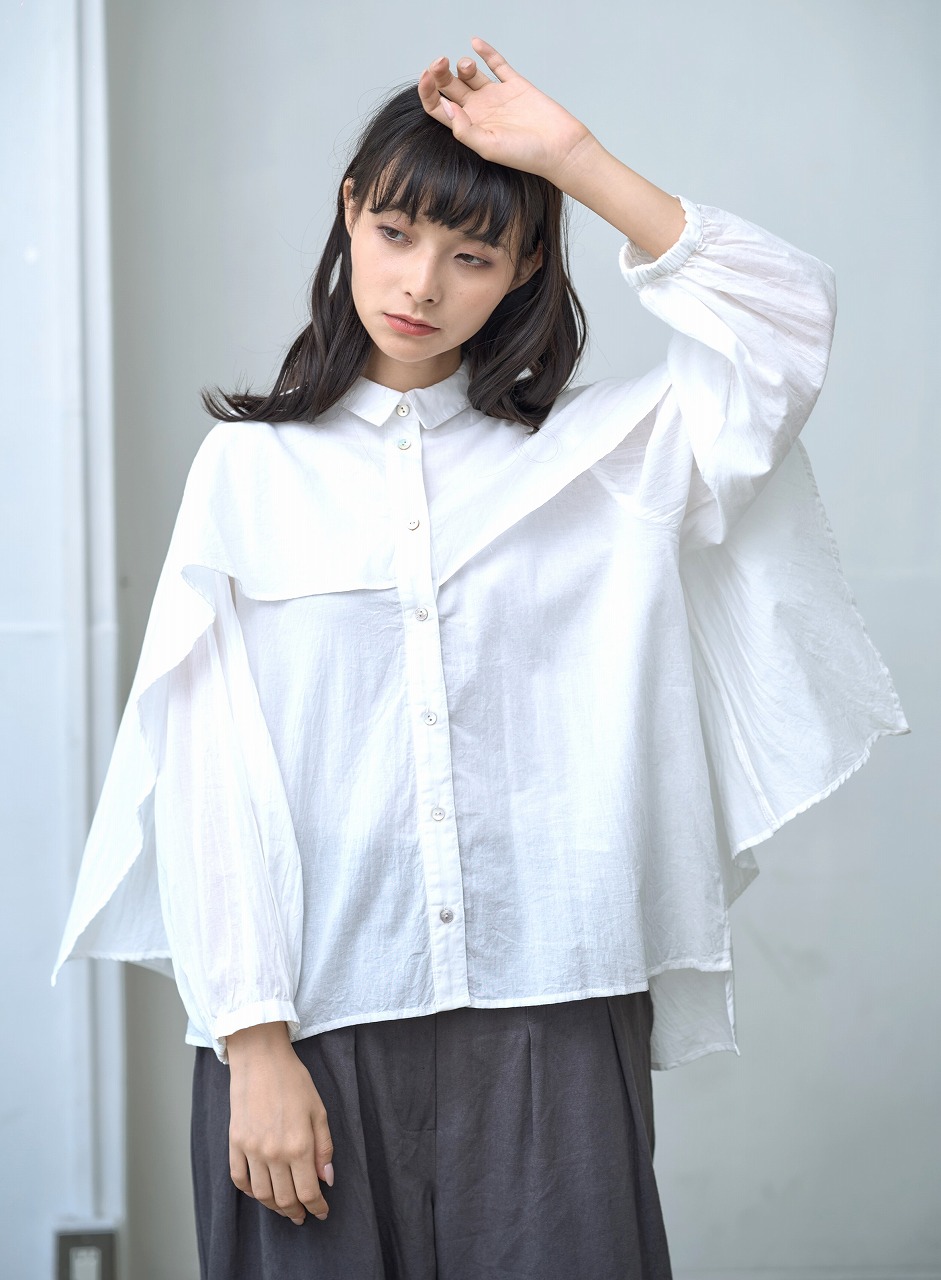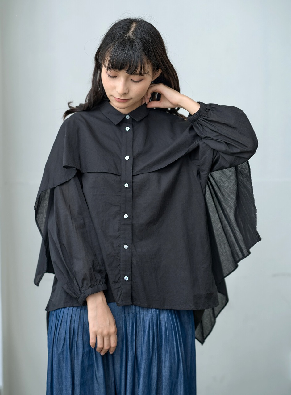 ふんわりと羽織ったようなケープディテールが印象的なブラウス。 前開きのシャツ型に、肩から大胆に広がるケープが重なり、360度どこから見ても揺れ感のある立体的なシルエットを演出します。 袖口のギャザーとケープの縁に入ったやさしいドレープが、まるで風をまとっているような軽やかさを感じさせます。 様々なボトムと相性が良く、モードにもエレガントにも着こなせる一枚。 ワイドパンツやタイトスカートなど、ボトムス次第で印象をがらりと変えることもできる主役アイテムです。