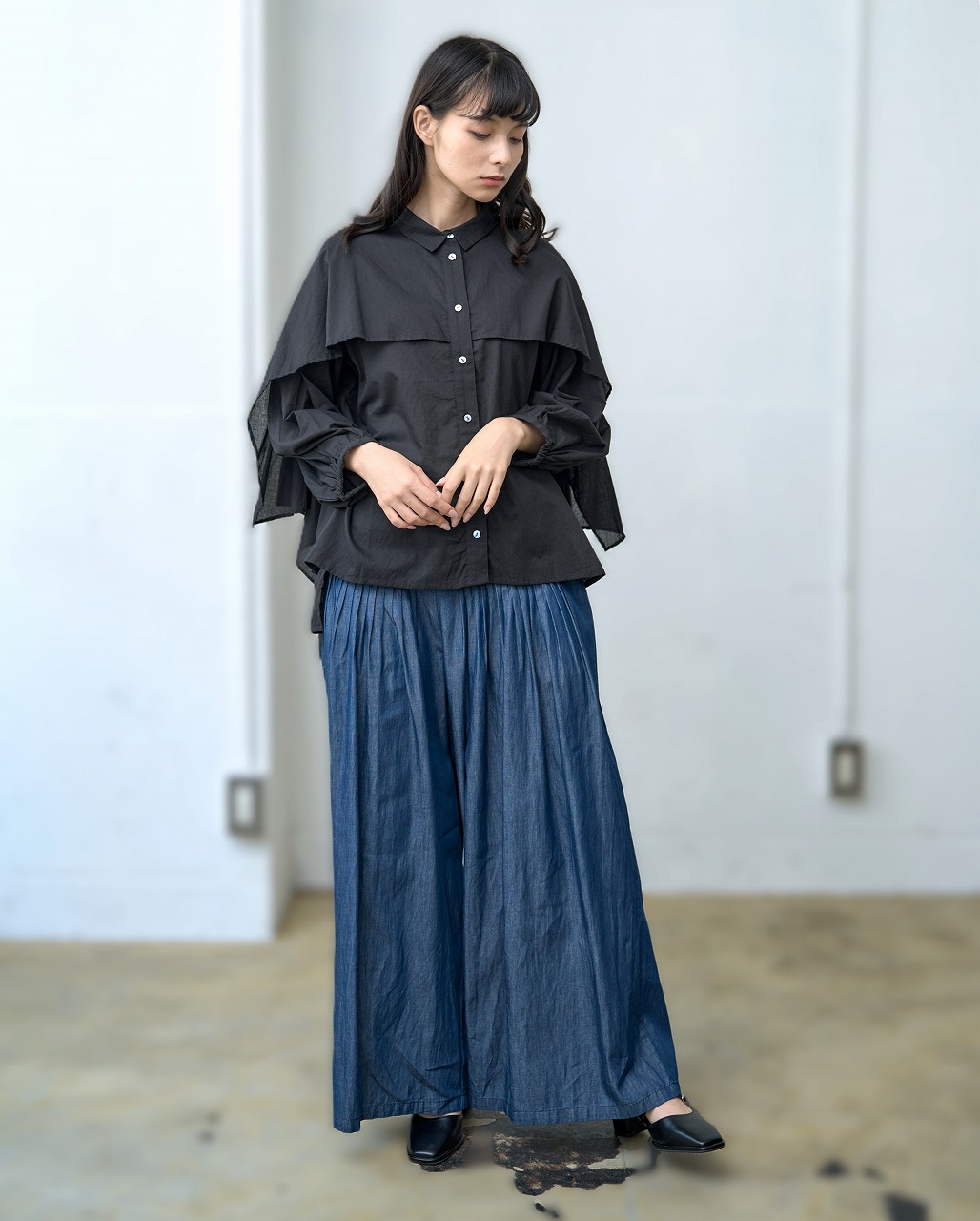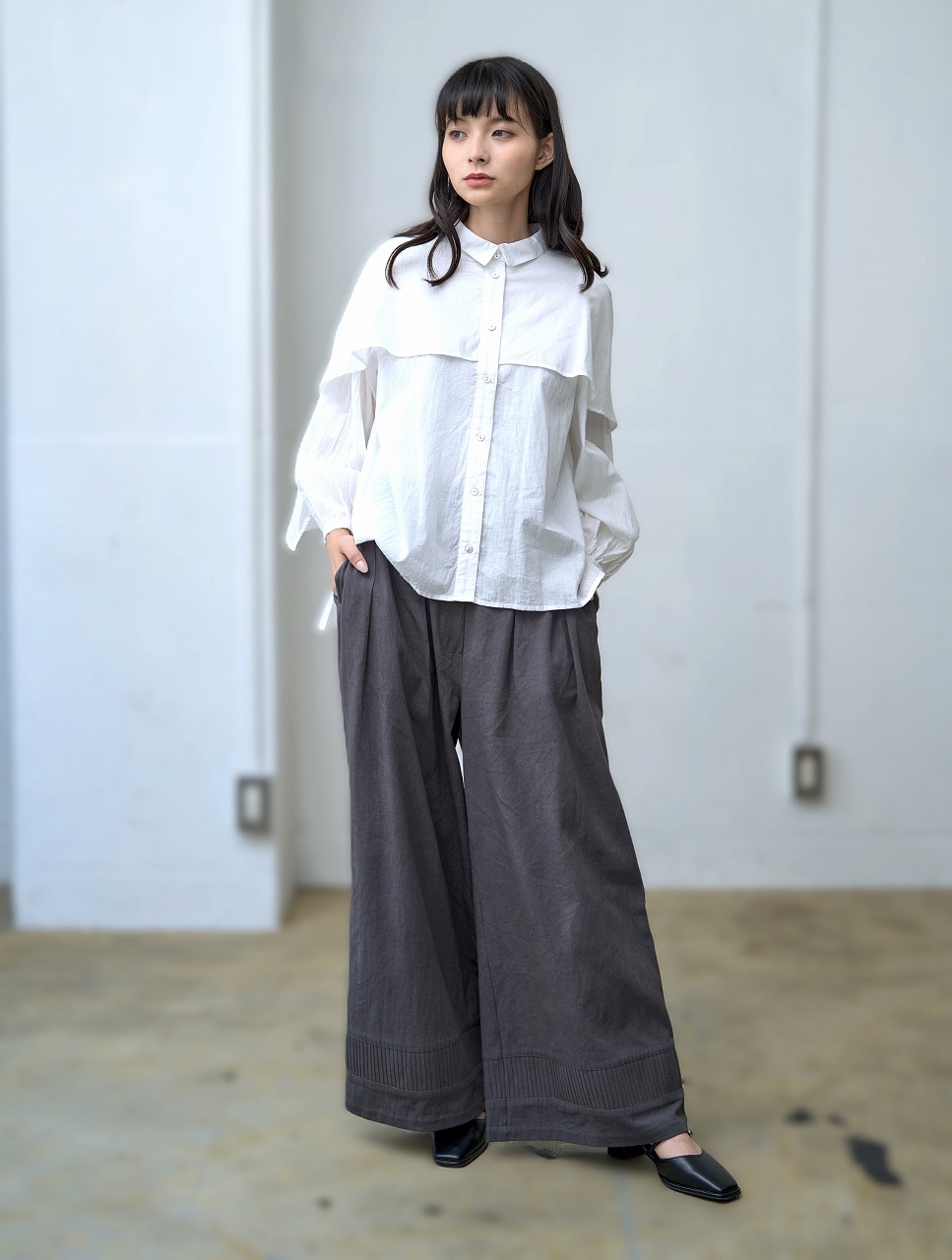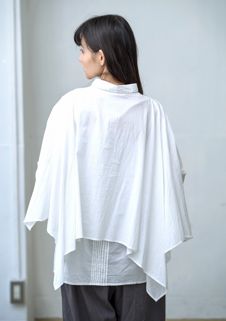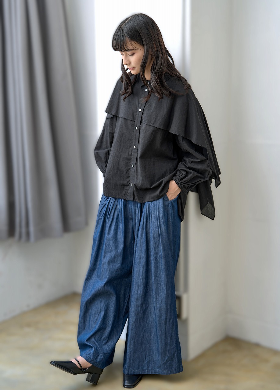 ふんわりと羽織ったようなケープディテールが印象的なブラウス。 前開きのシャツ型に、肩から大胆に広がるケープが重なり、360度どこから見ても揺れ感のある立体的なシルエットを演出します。 袖口のギャザーとケープの縁に入ったやさしいドレープが、まるで風をまとっているような軽やかさを感じさせます。 様々なボトムと相性が良く、モードにもエレガントにも着こなせる一枚。 ワイドパンツやタイトスカートなど、ボトムス次第で印象をがらりと変えることもできる主役アイテムです。