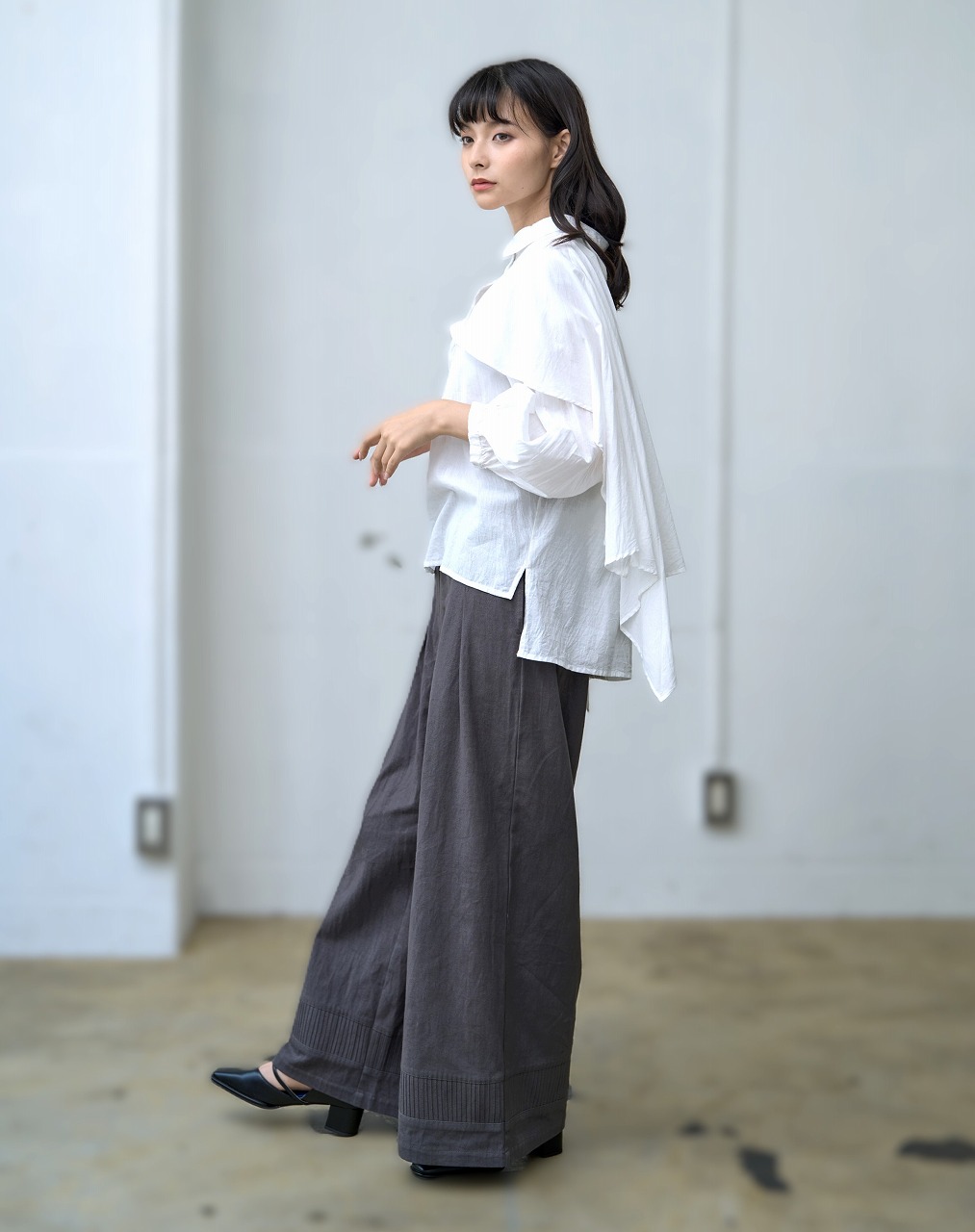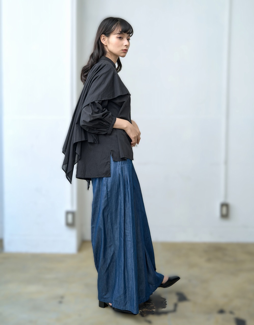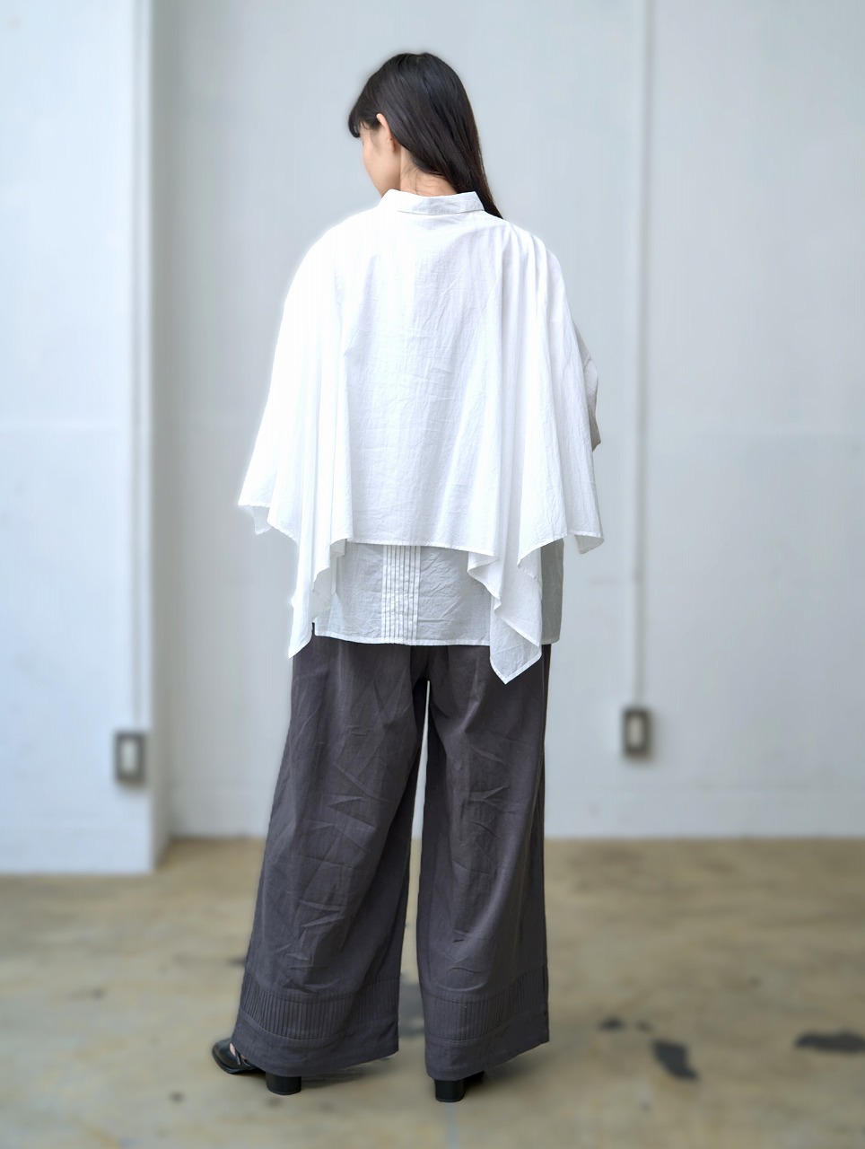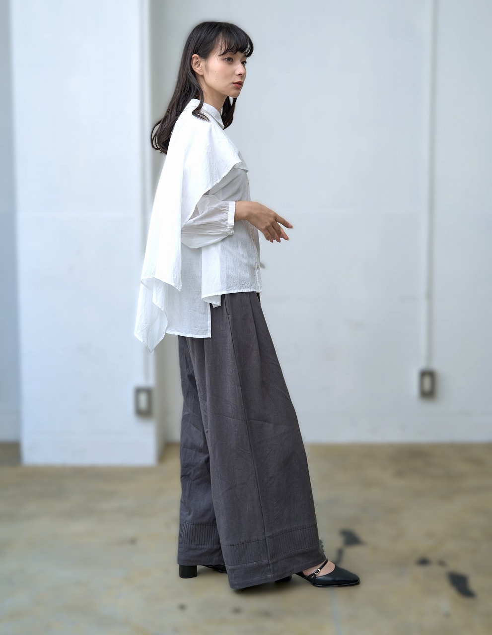 ふんわりと羽織ったようなケープディテールが印象的なブラウス。 前開きのシャツ型に、肩から大胆に広がるケープが重なり、360度どこから見ても揺れ感のある立体的なシルエットを演出します。 袖口のギャザーとケープの縁に入ったやさしいドレープが、まるで風をまとっているような軽やかさを感じさせます。 様々なボトムと相性が良く、モードにもエレガントにも着こなせる一枚。 ワイドパンツやタイトスカートなど、ボトムス次第で印象をがらりと変えることもできる主役アイテムです。