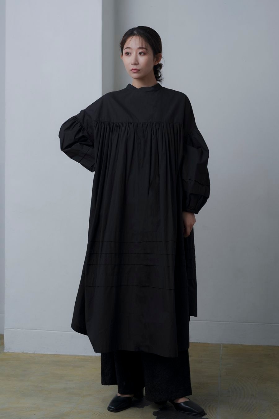 動きのあるタックデザインが魅力のワンピース ボリューム感のあるタックボーダーデザインが特徴的で、シンプルながらも存在感のあるシルエットに仕上げました。 ゆったりとしたシルエットがリラックス感を演出し、体のラインを美しく見せてくれます。 軽やかでハリのある高密度ポプリン素材を使用し、ナチュラルながらも洗練された印象に。 通気性が良く、さらっとした肌触りが快適な着心地を実現します。 バックスタイルにもこだわり、後ろ身頃のギャザーがふんわりとした立体感をプラス。 肩周りの動きやすさも考慮し、デザインと実用性を兼ね備えた仕上がりになっています。