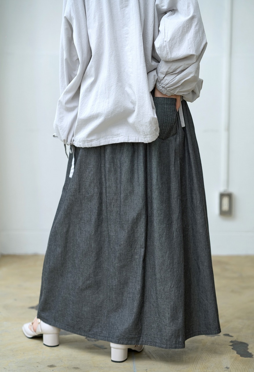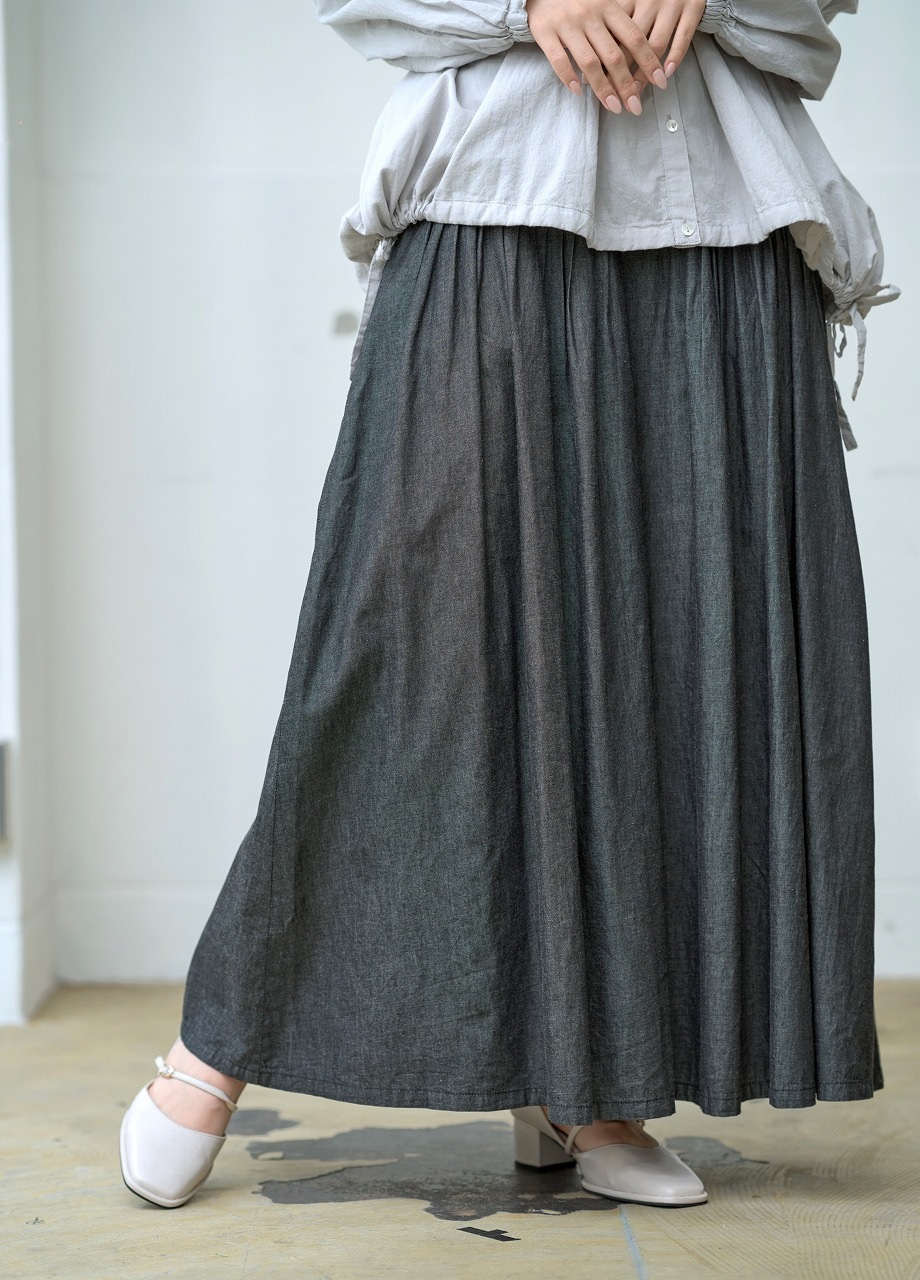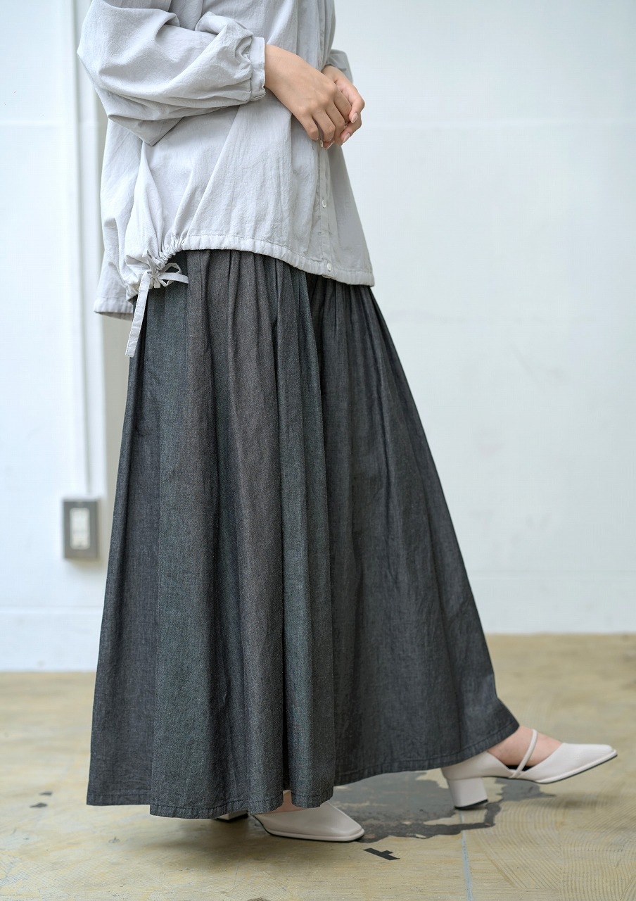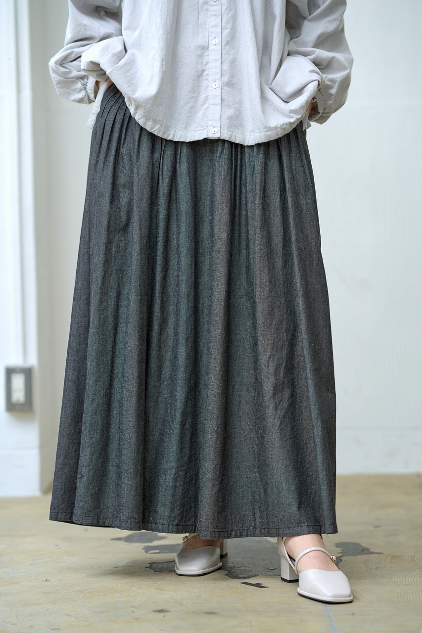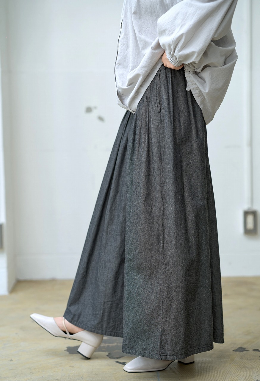 ウエストに細かく寄せられたピンタックがアクセントになったスカート。 腰位置からやさしく広がるフレアラインが美しく、歩くたびに揺れる裾が女性らしさを引き立てます。 ジャストウエストで履くことで脚長効果もあり、トップスをタックインするだけでバランスの取れた着こなしに。 シャツやブラウスとの相性もよく、季節を問わずワードローブの中心になる一着です。