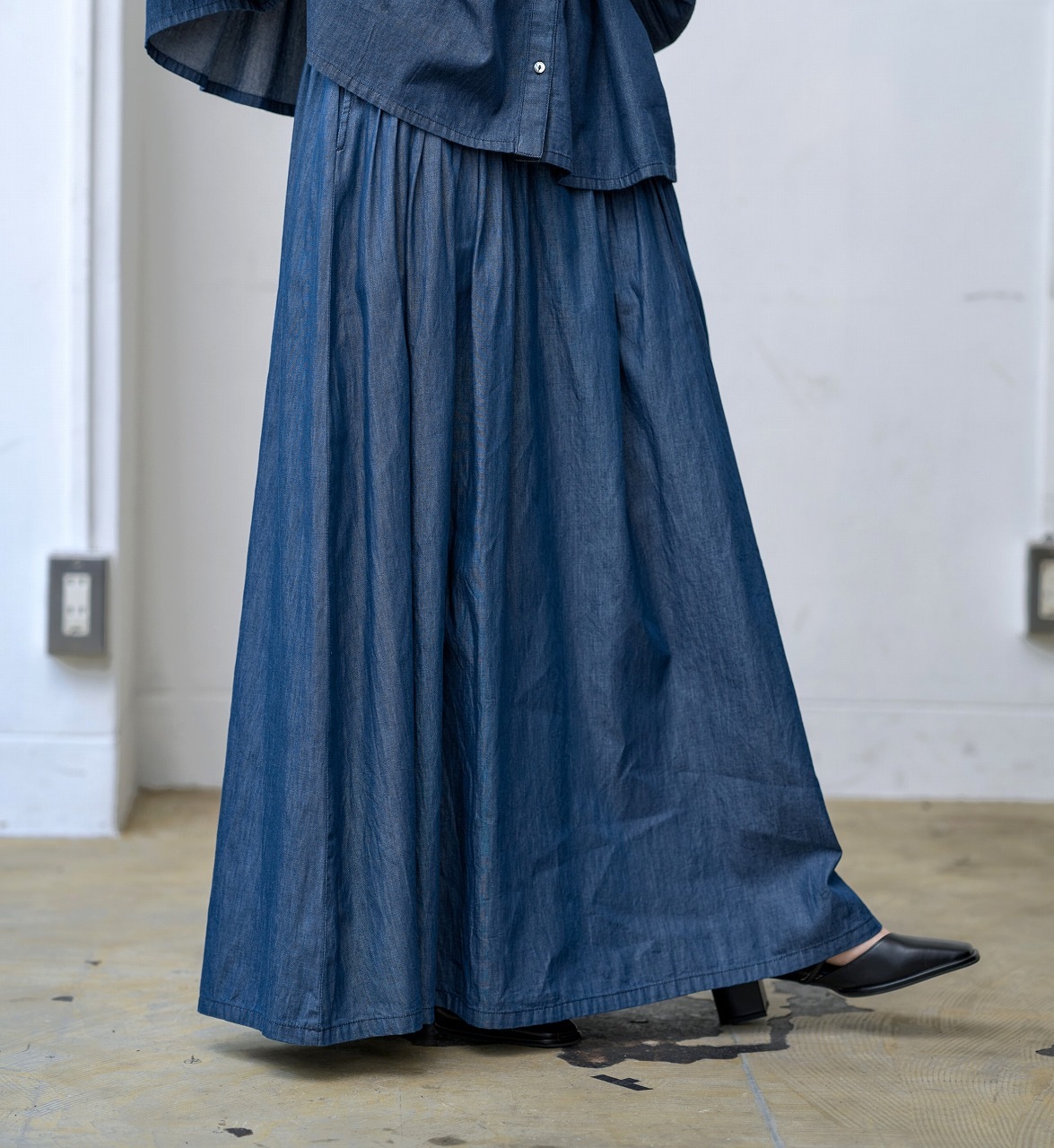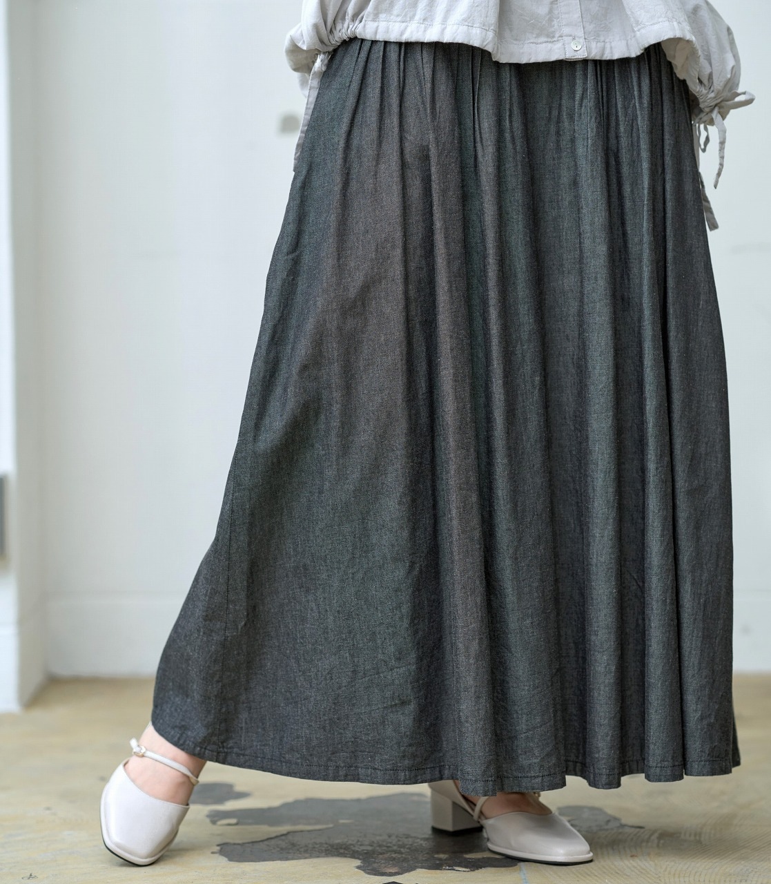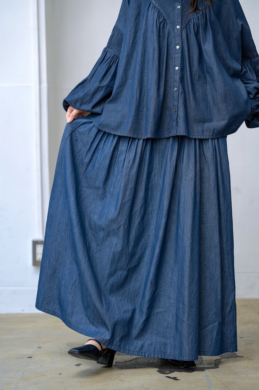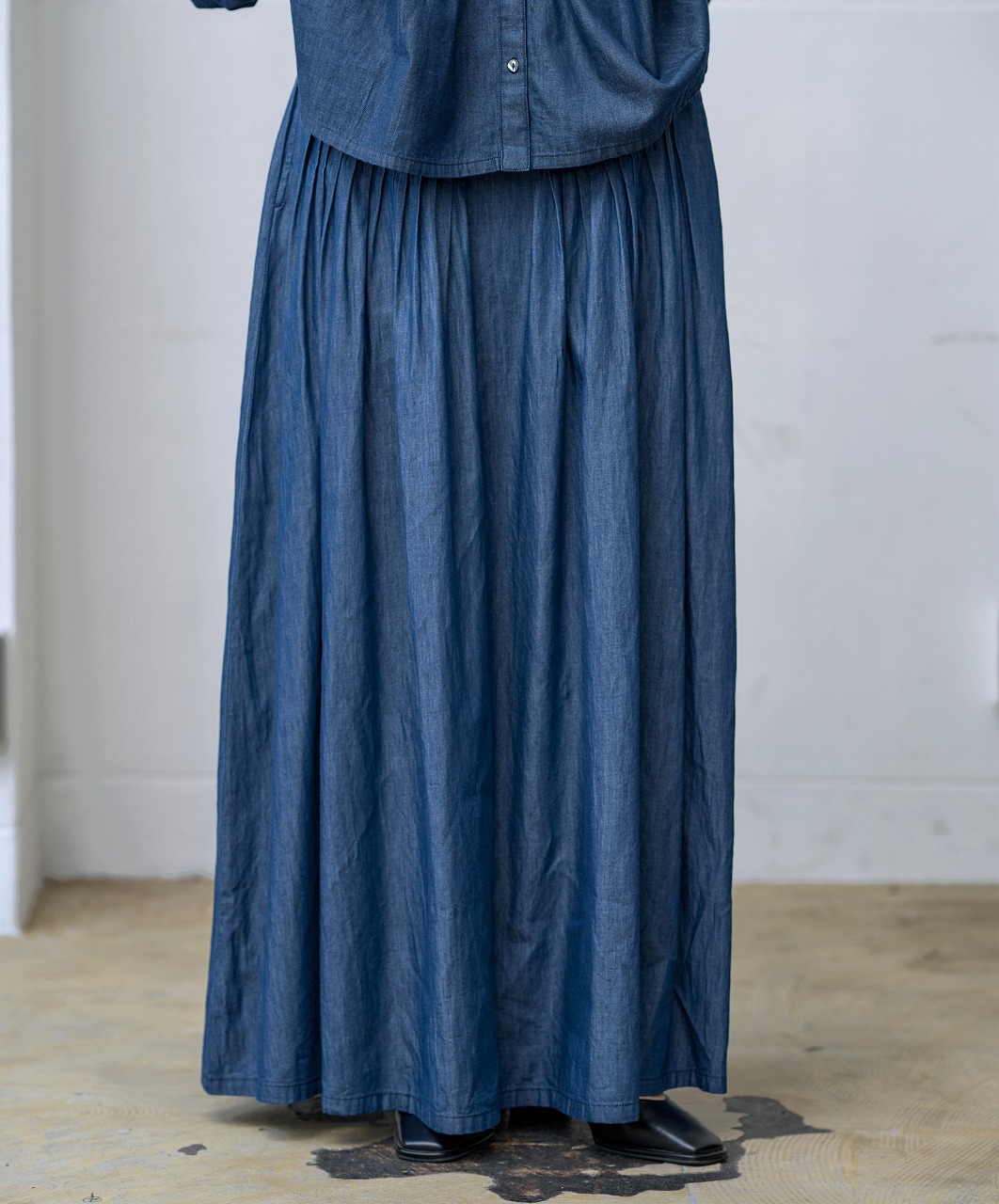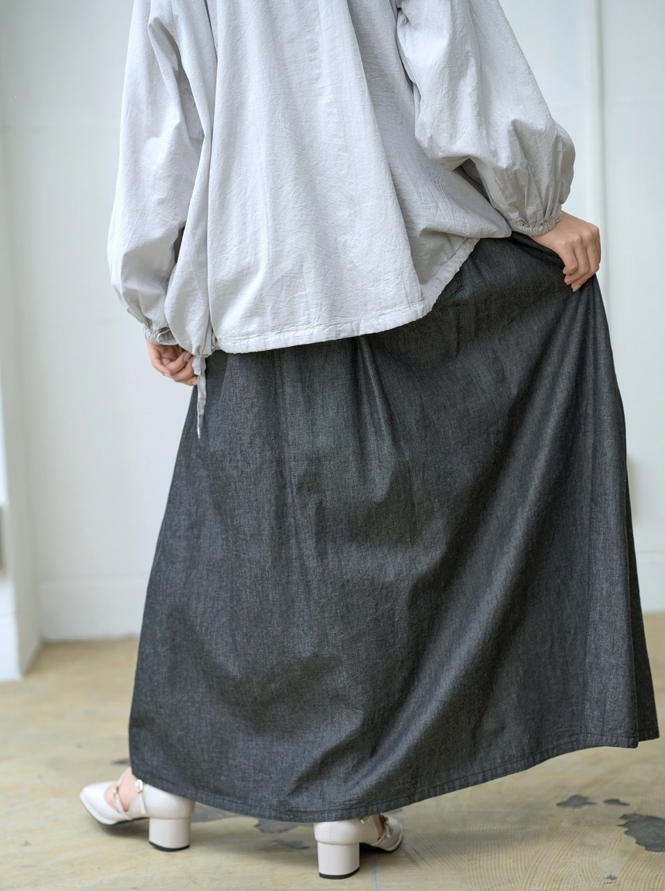 ウエストに細かく寄せられたピンタックがアクセントになったスカート。 腰位置からやさしく広がるフレアラインが美しく、歩くたびに揺れる裾が女性らしさを引き立てます。 ジャストウエストで履くことで脚長効果もあり、トップスをタックインするだけでバランスの取れた着こなしに。 シャツやブラウスとの相性もよく、季節を問わずワードローブの中心になる一着です。